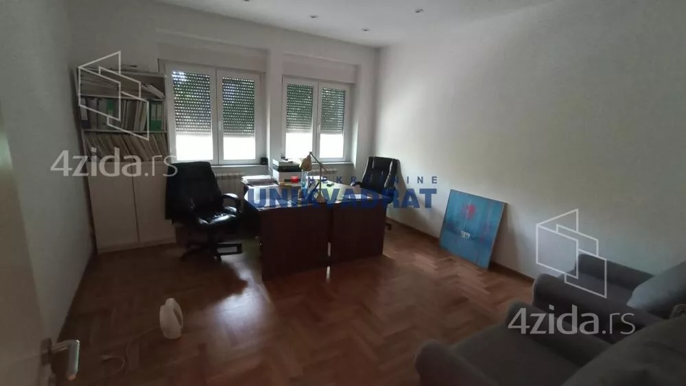 Velika ulazna prostorija iz koje se ulazi u tri kancelarije. Dva mokra čvora i kuhinja. Etažno grejanje na gas. Prostor se izdaje nenamešten. Prostor će biti slobodan od 01.06. .