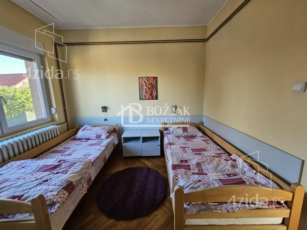 Izdaje se prvi sprat kuće na Zelenom polju površine oko 80m2. Sprat ima odvojen ulaz, tako da je to praktično stan koji se sastoji se od hodnika, tri spavaće sobe koja svaka ima izlaz na po jednu terasu, dnevne sobe sa trpezarijom i kuhinjom i kupatilom. Stan je namešten, u sobama su kreveti i ormani, dve sobe su trokrevetne a jedne je dvokrevetna. U kupatilu je veš mašina, TV u dnevnoj sobi, kuhinja sa šporeton i frižiderom. Stan ima internet. Grejanje je centralno na gas. U zakupninu su uračunati svi troškovi, osim grejanja. Pogodan je za smeštaj radnika. Agencijska provizija 50%