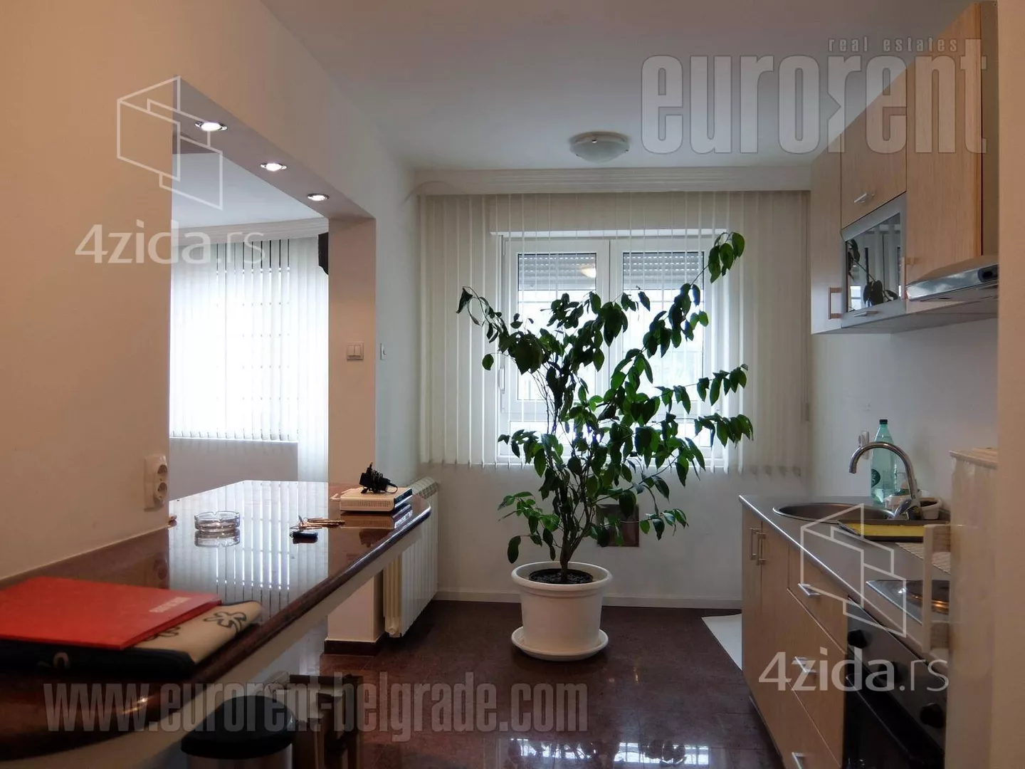 Odličan stan, na prvom spratu zgrade na Novom Beogradu, u poslovnom okruženju. U blizini je Centra Sava i brojnih poslovnih zgrada. Sastoji se od antrea, jedne sobe koja je spojena šankom sa opremljenom kuhinjom i izlazi na terasu i druge, manje sobe. U obe sobe se ulazi iz prostranog antrea sa granitnim podom. Zgrada je lepo održavana. Na raspolaganju je garaža koja se dodatno plaća.