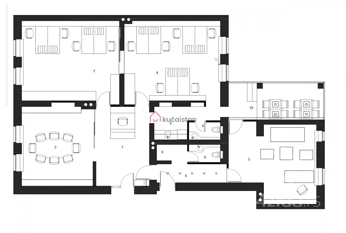 The interior is easily adaptable from a design perspective. Everything is tastefully arranged with style, fitting almost any concept for a modern commercial space. The office rooms offer views of greenery and are filled with natural daylight. The private courtyard is a standout feature, also landscaped with garden furniture for relaxation. Ideal for offices, a showroom, a studio, an educational center, or a clinic...
