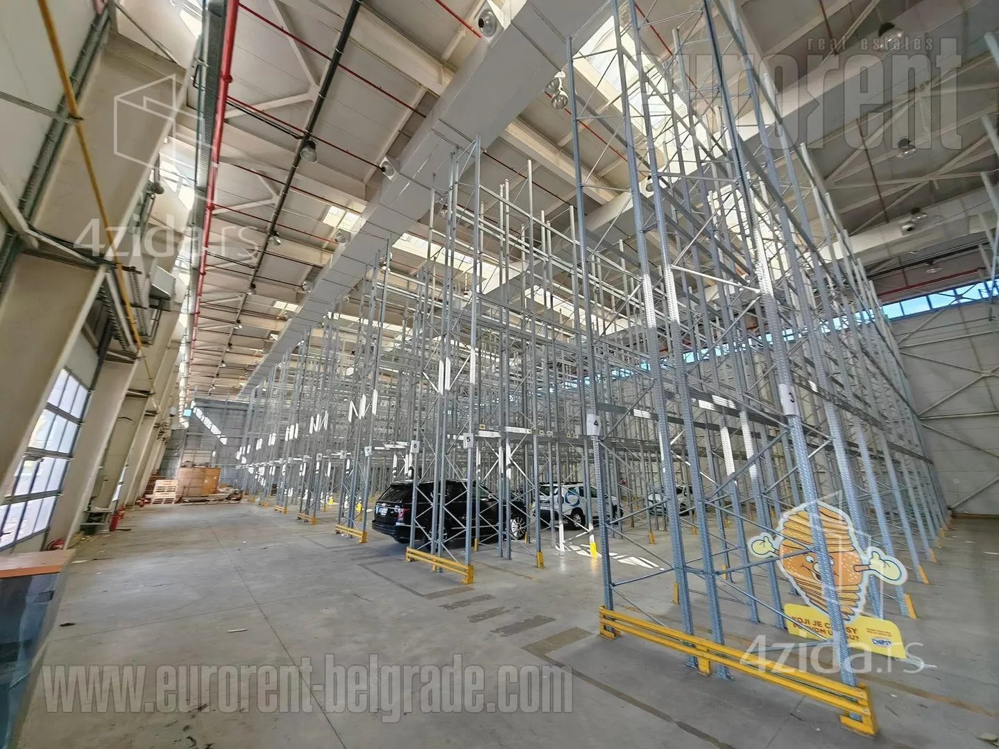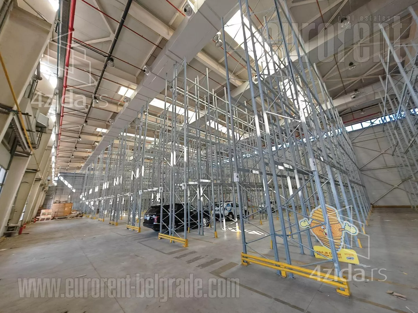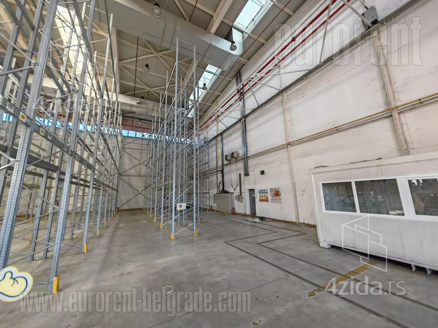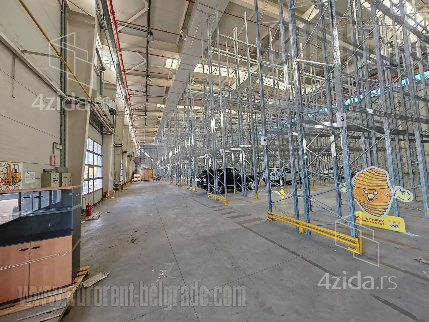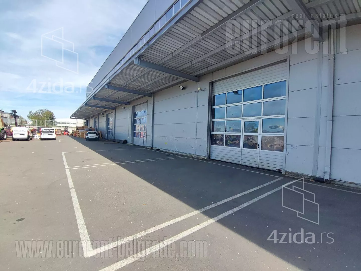 Poslovno magacinski kompleks smešten na izuzetnoj lokaciji, u neposrednoj blizini glavnog poštanskog magacina, i ima izlaz na autoput za Novi Sad, kao i na autoput za Šid. U neposrednoj blizini je izlaz na novi most preko Dunava. Poslovno okruženje i velika frekvencija saobraćaja. Magacin se nalazi na klasičnom prizemlju i ulaz u magacinski prostor je omogućen preko 5 ulazno/izlaznih kamionskih vrata. Visina plafona je 14 m. Prostor je pravougaonog oblika, sa sprovedenom centralnom ventilacijom i svlačionicama i mokrim čvorom za zaposlene. Pod je presvučen epoksidnim premazom. Može se podeliti na nekoliko segmenata različitih površina, u zavisnosti od potrebe. Odličan prostor pokriven regalnim policama. Poslovni prostor koji pripada magacinu se nalazi na pročelju zgrade i sastoji se od dva nivoa, prizemlja i prvog sprata, ukupne površine cca 380 m2. Veličina svakog nivoa je oko 310 m2, sa lakim pregradnim zidovima koji se mogu organizovati prema potrebama korisnika. Na svakom nivou je muško/ženski toalet. Ceo kompleks je lako dostupan, sa velikim parkingom za 30 vozila, šleperskim prilazom i manipulativnim prostorom.