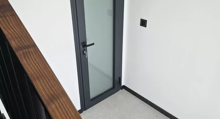 Kancelarijski deo Pr+1 ukupne površine 300m2 (Dole je u centralnom delu prijemni deo sa čajnom kuhinjom toaletom, jednom kancelarijom u jednom krilu koji je predviđen za komercijalu, i prostorijama-svlačionicom, toaletima, kuhinjom i trpezarijom, kotlarnicom, u drugom krilu. Sve sa velikim staklenim portalima (aluminijumski profili).