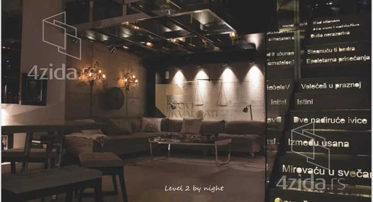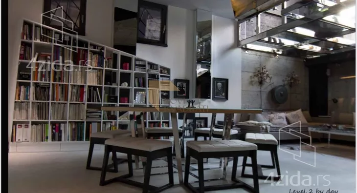 Prostor je koncipiran na dva nivoa. Gornji nivo čini galerija, dok se u donjem nalaze jedna otvorena prostorija, skrivena kuhinja, ostava i luksuzno opremljeno kupatilo.