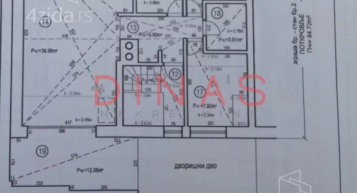 Drugi ulaz vodi u deo kuće od 33m², sa jednom sobom, odvojenom kuhinjom i kupatilom u prizemlju.