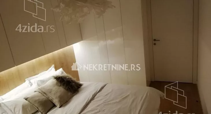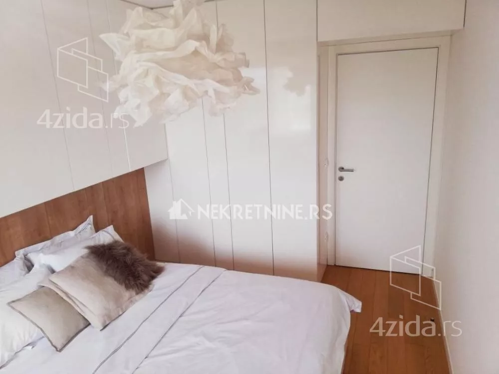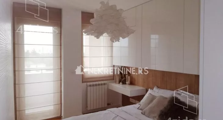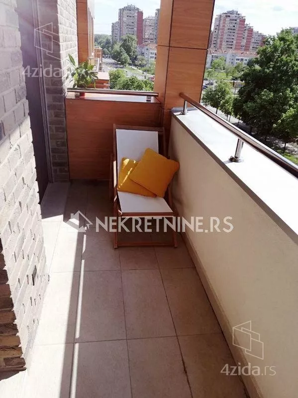 Ultra lux moderno opremljen stan, na odličnoj lokaciji- A Blok –pogled na ulicu Omladinskih brigada.Peti sprat, lamela A2.Opremljen sa posebno dizajniranim ugradnim namestajem i tehnikom, drvo aluminijum stolarijom,elektricnim roletnama, kliznim komarnicima, hrastovim parketom, Keramo Marazzi keramikom.Stan je sastavljen od kuhinje I trpezarije, dnevne I spavace sobe, kupatila I terase, povrsine 51 m2. Agencijska provizija 50% od prve zakupnine.