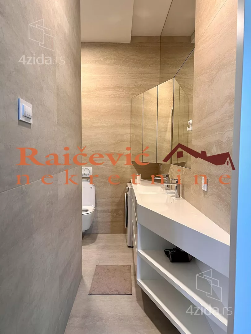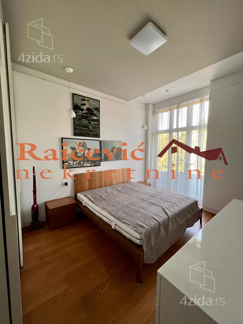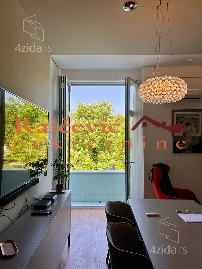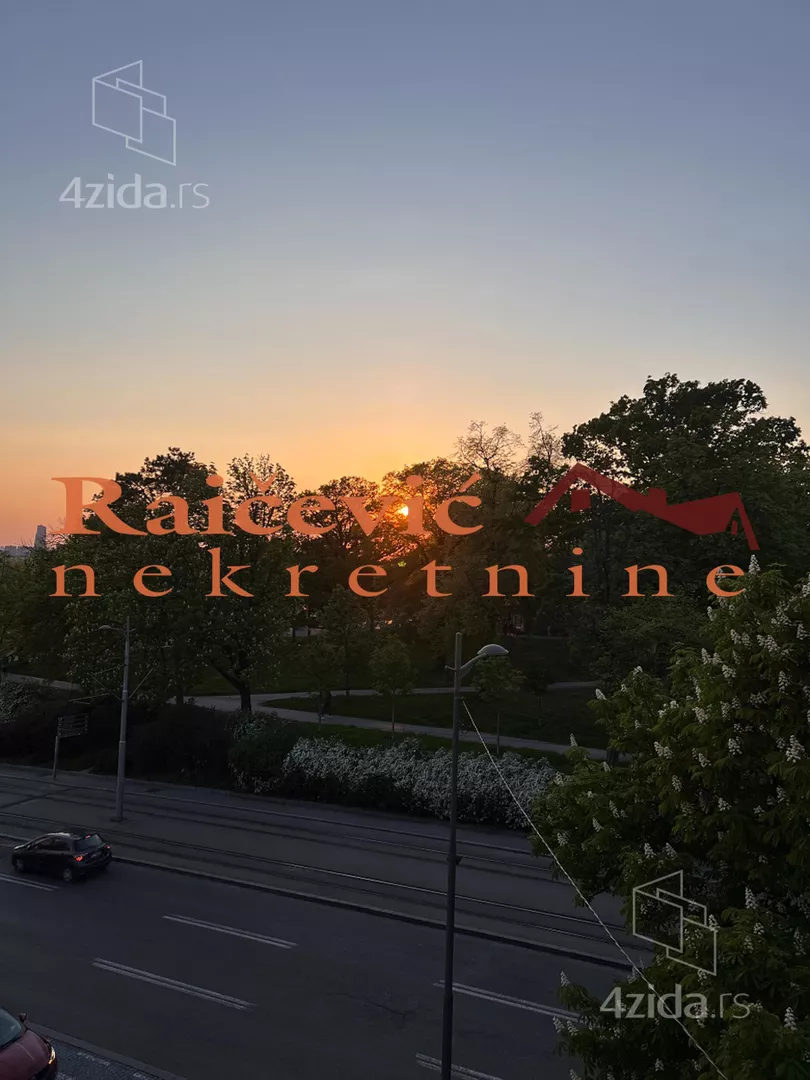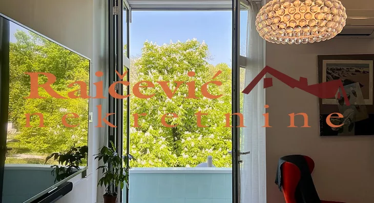 Salonac (visina u stanu je 3.2 m), orijentisan ka ulici, sa otvorenim pogledom na Kalemegdan i reku, kompletno renoviran (nove vodovodne i strujne instalacije, laminat postavljen preko parketa, pvc stolarija), potpuno nov namestaj.