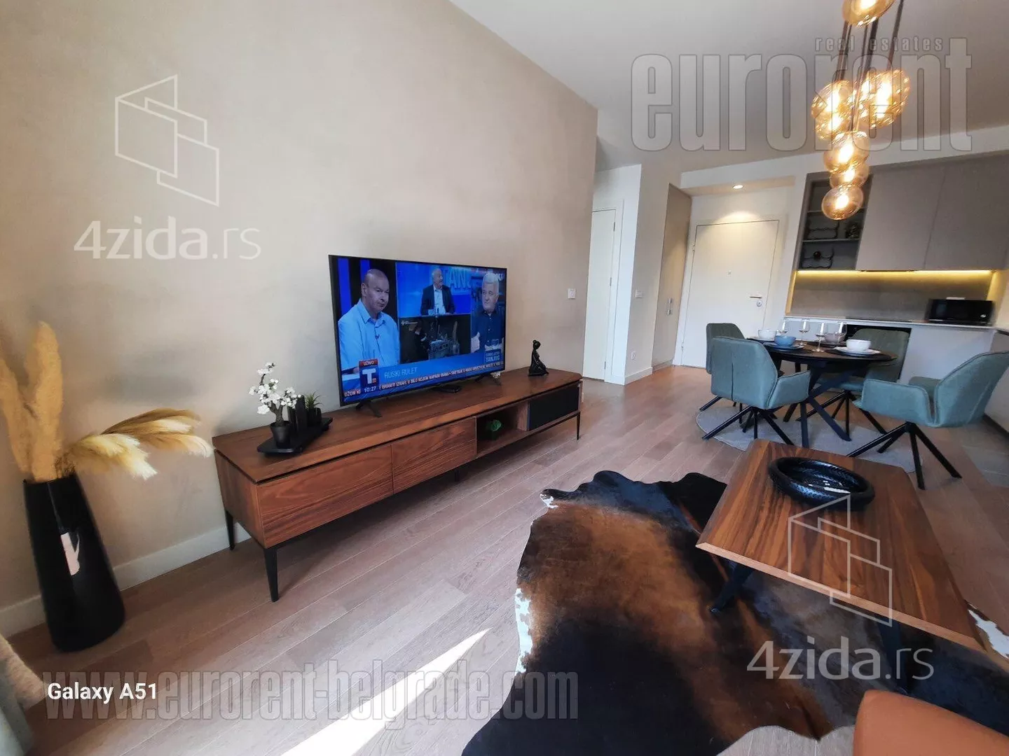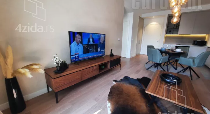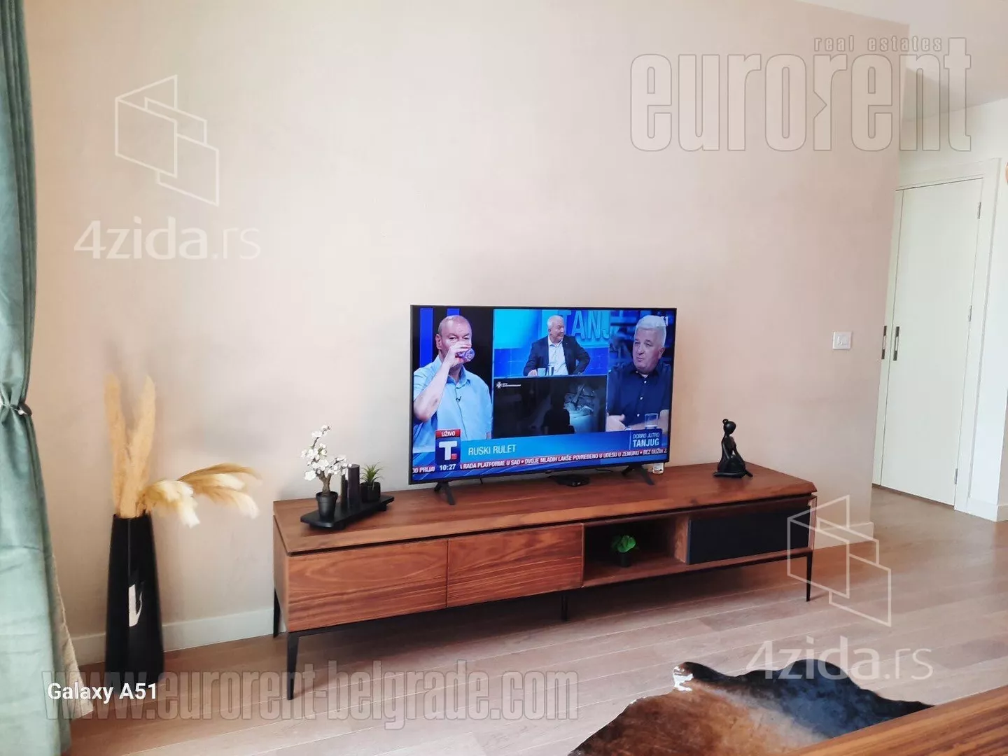 Moderan stan apartmantskog tipa, smešten u kompleksu Beograd na vodi. Moderno okruženje i kompleks sa mnoštvom raznovrsnog komercijalnog sadržaja (kafići, restorani, šetalište, igralište za decu) kao i tržni centar Galerija. Zgrada je moderne gradnje, sa dva lifta, a stan se nalazi na drugom spratu. Strukturu prostora čini antre, dnevni boravak u okviru koga su kuhinja, trpezarija i iz ovog dela se izlazi na terasu. Drugi deo stana čini spavaća soba sa bračnim krevetom i kupatilo sa tuš kabinom. Enterijer je opremljen nameštajem modernog dizajna, kvalitetna ugradna tehnika, osvetljenje i kućni aparati. Za budućeg zakupca je obezbeđeno jedno parking mesto u garažnom delu zgrade uz doplatu (100e).