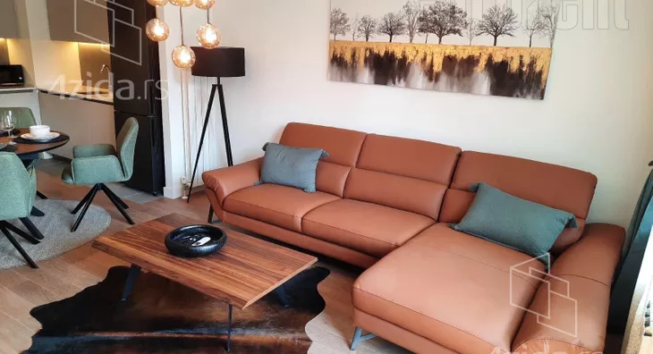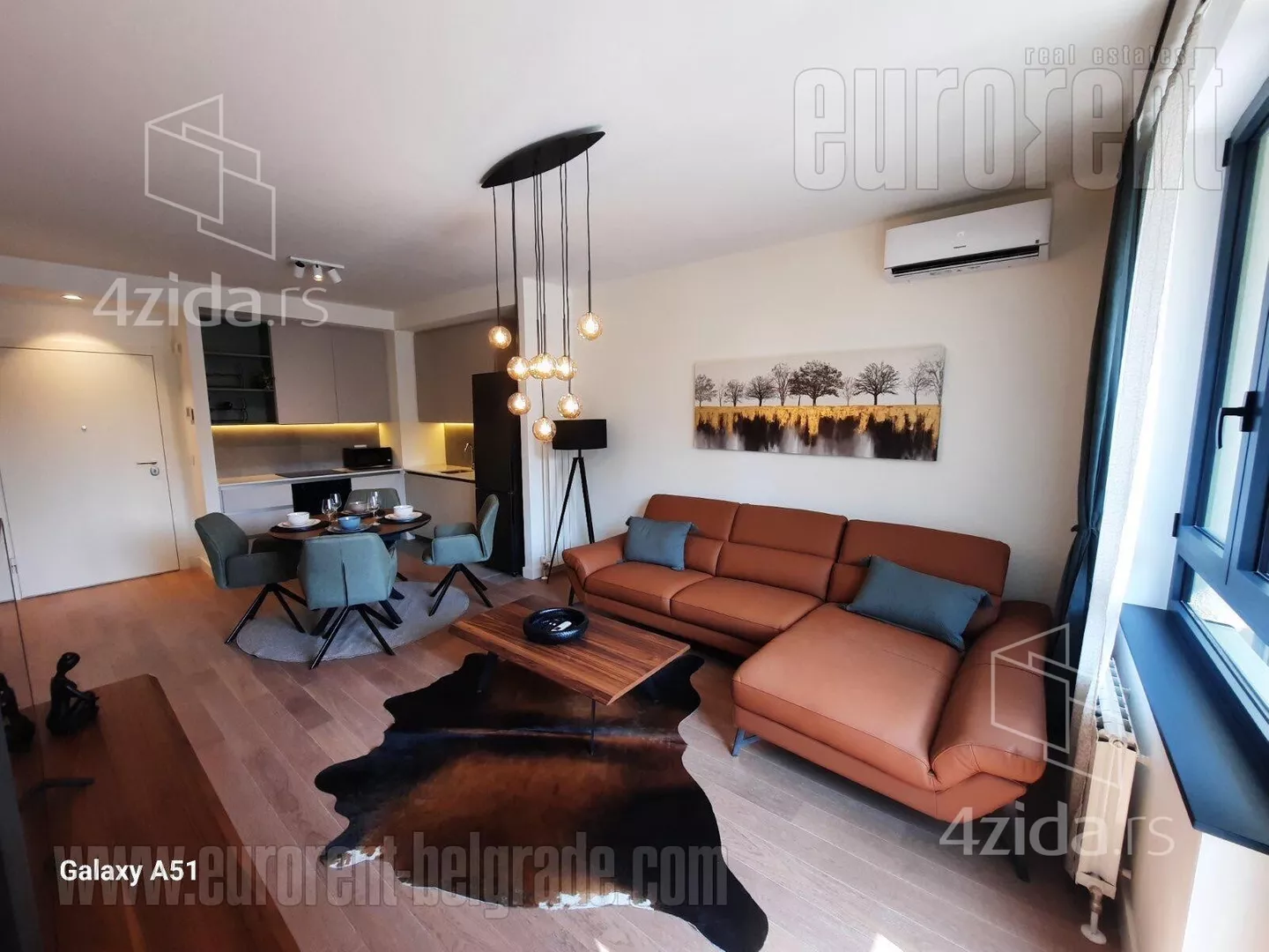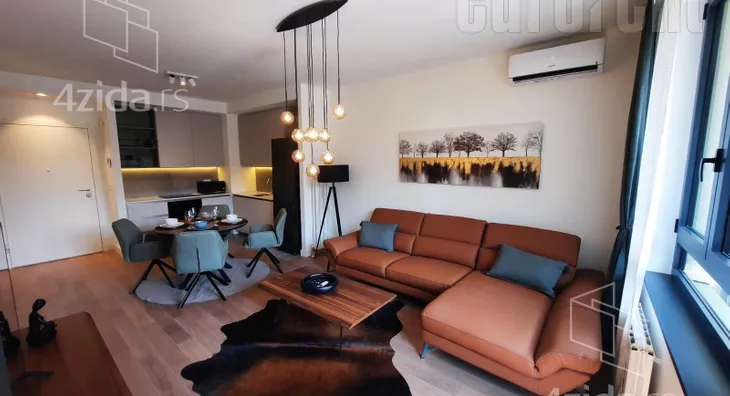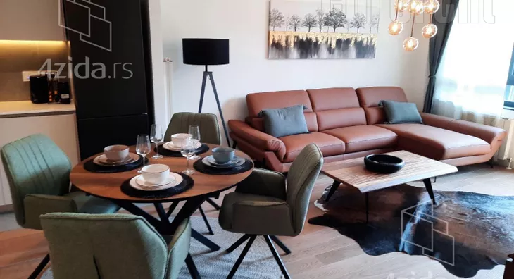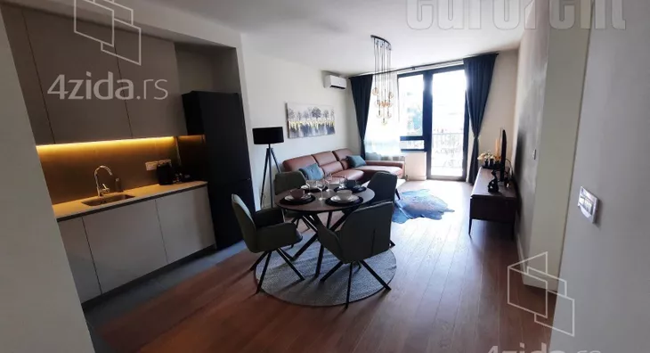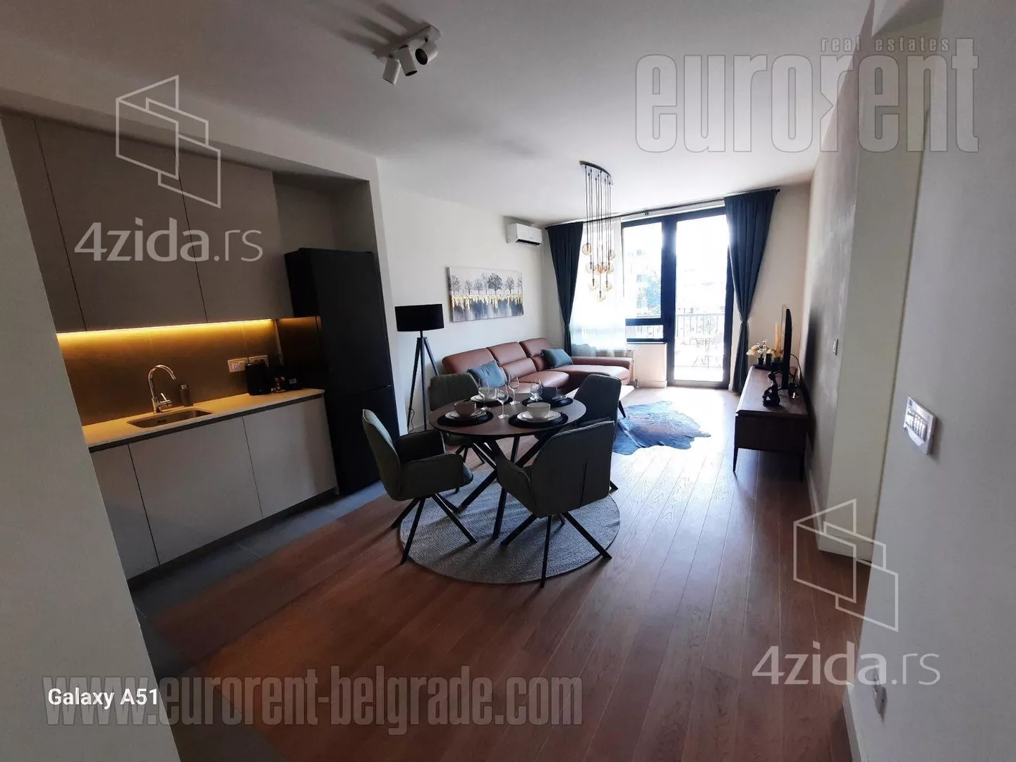 Moderan stan apartmantskog tipa, smešten u kompleksu Beograd na vodi. Moderno okruženje i kompleks sa mnoštvom raznovrsnog komercijalnog sadržaja (kafići, restorani, šetalište, igralište za decu) kao i tržni centar Galerija. Zgrada je moderne gradnje, sa dva lifta, a stan se nalazi na drugom spratu. Strukturu prostora čini antre, dnevni boravak u okviru koga su kuhinja, trpezarija i iz ovog dela se izlazi na terasu. Drugi deo stana čini spavaća soba sa bračnim krevetom i kupatilo sa tuš kabinom. Enterijer je opremljen nameštajem modernog dizajna, kvalitetna ugradna tehnika, osvetljenje i kućni aparati. Za budućeg zakupca je obezbeđeno jedno parking mesto u garažnom delu zgrade uz doplatu (100e).