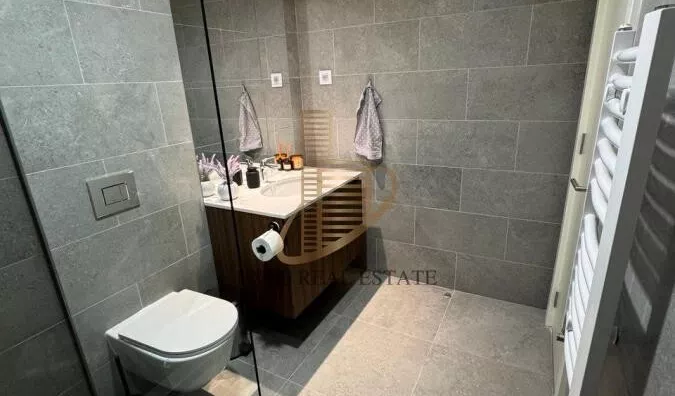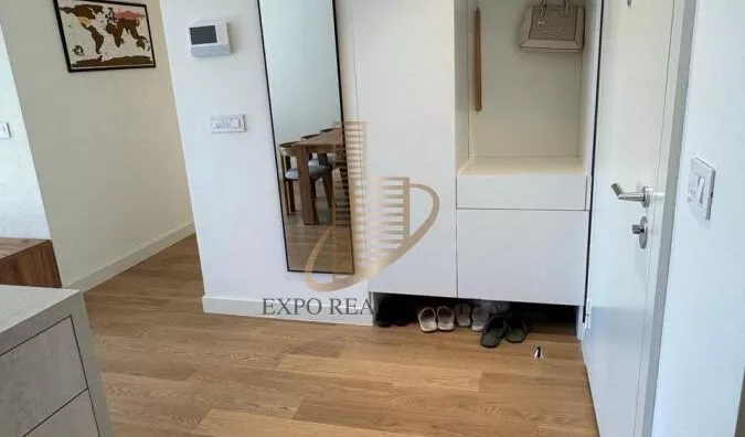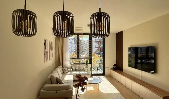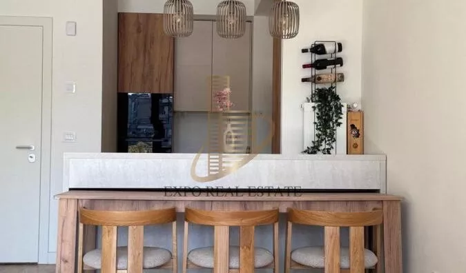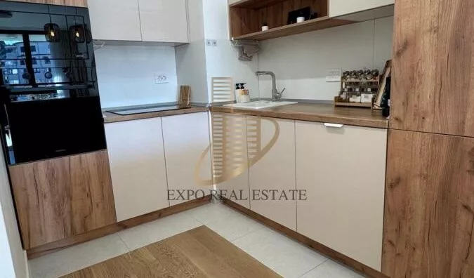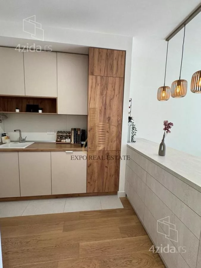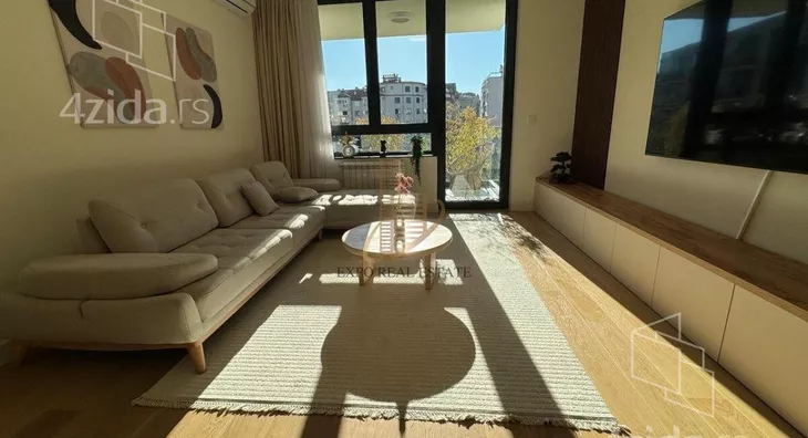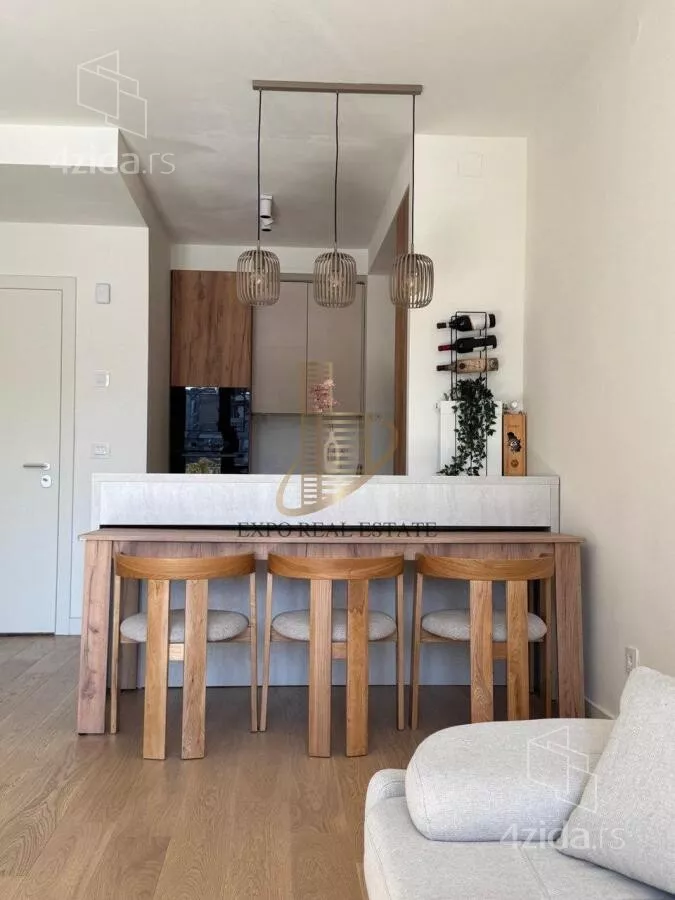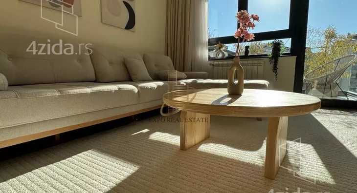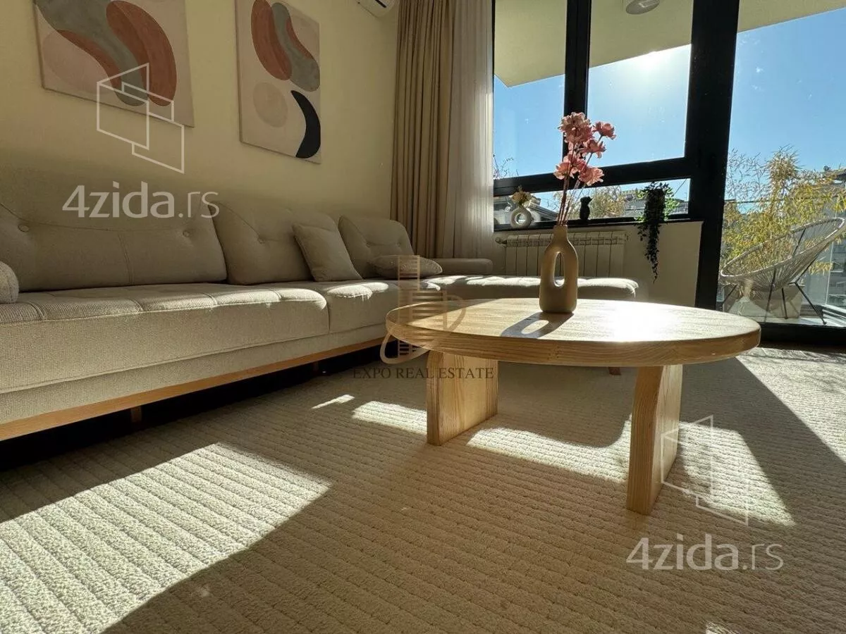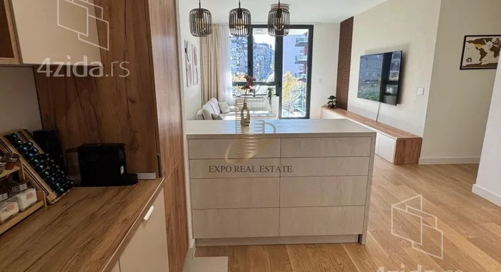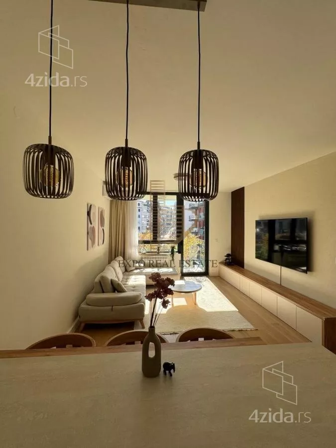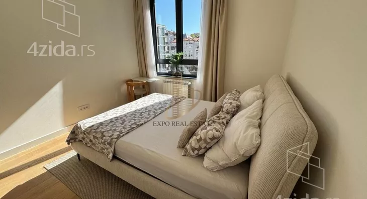 Stan je potpuno namešten i opremljen vrhunskim uređajima. Sastoji se od prostranog dnevnog boravka sa kuhinjom i trpezarijom, dve spavaće sobe, kupatila i terase sa prijatnim pogledom.