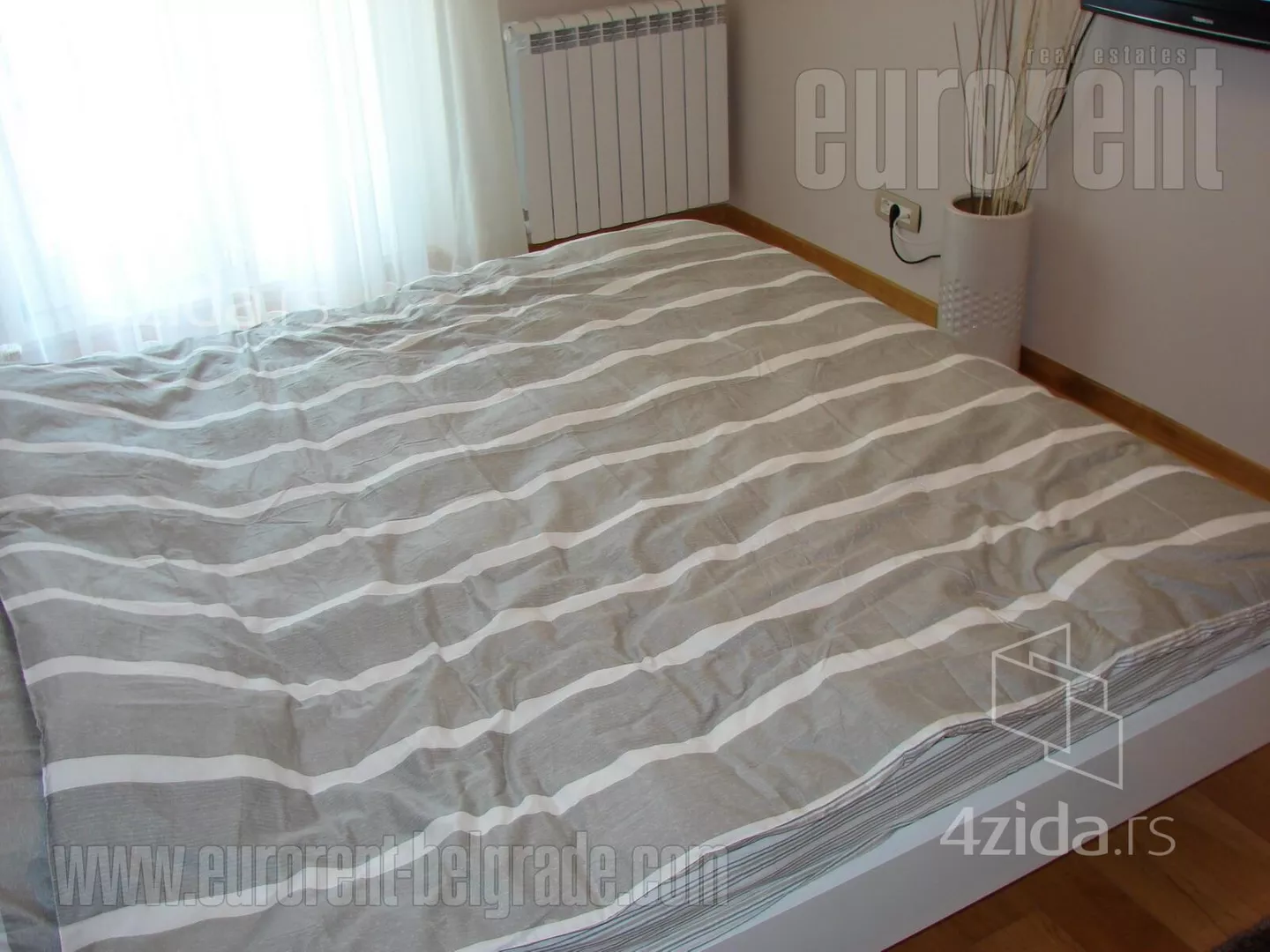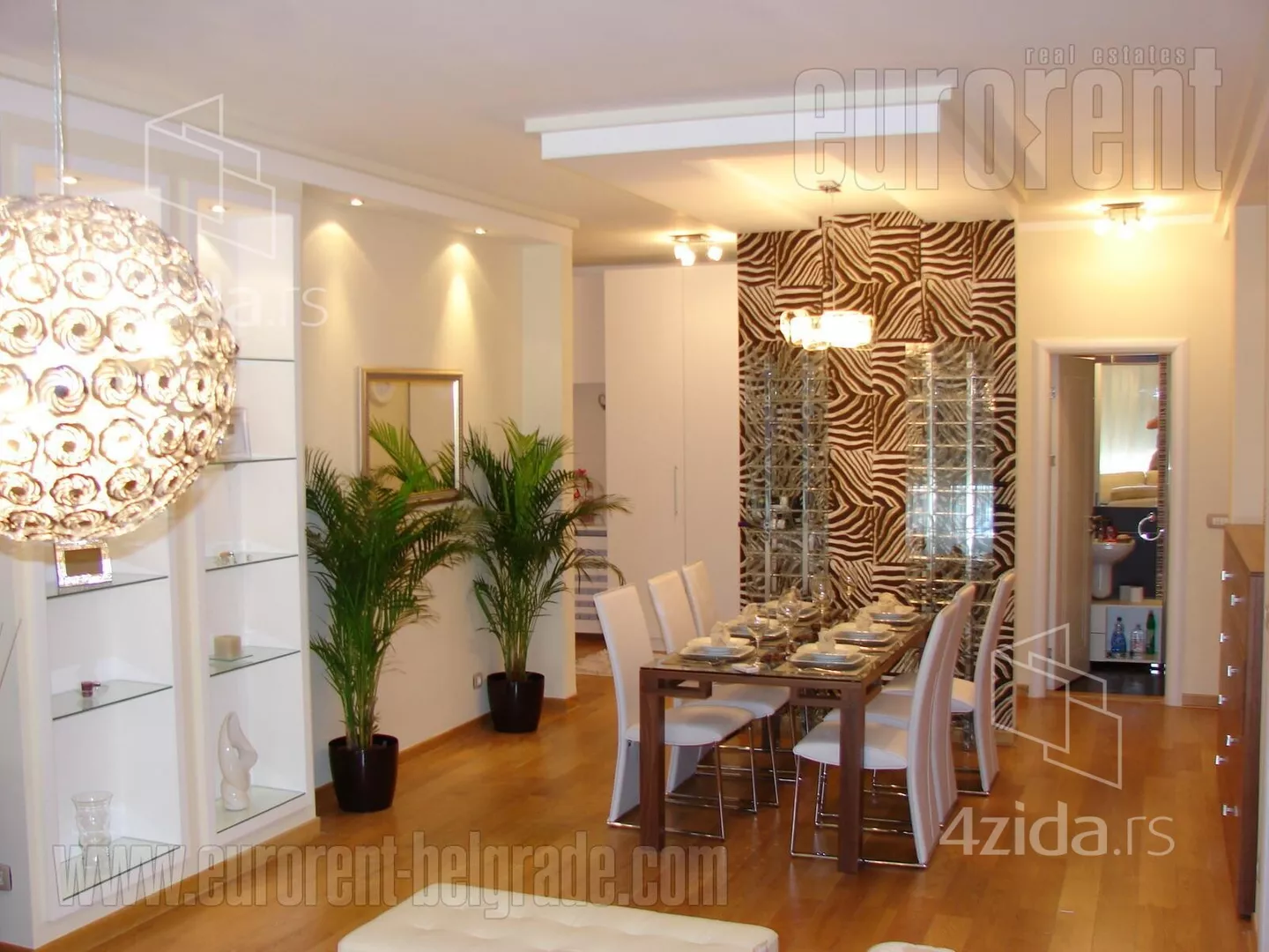 Odličan stan u novoj zgradi. Velika dnevna soba sa trpezarijom i terasom, gostinski toalet, kuhinja. U spavaćem bloku su dve spavaće sobe sa terasom, kupatilo sa toaletom. Na podu je parket i pločice, spušten plafon sa halogenom rasvetom. Garaža ispod zgrade, portirska služba 24h.