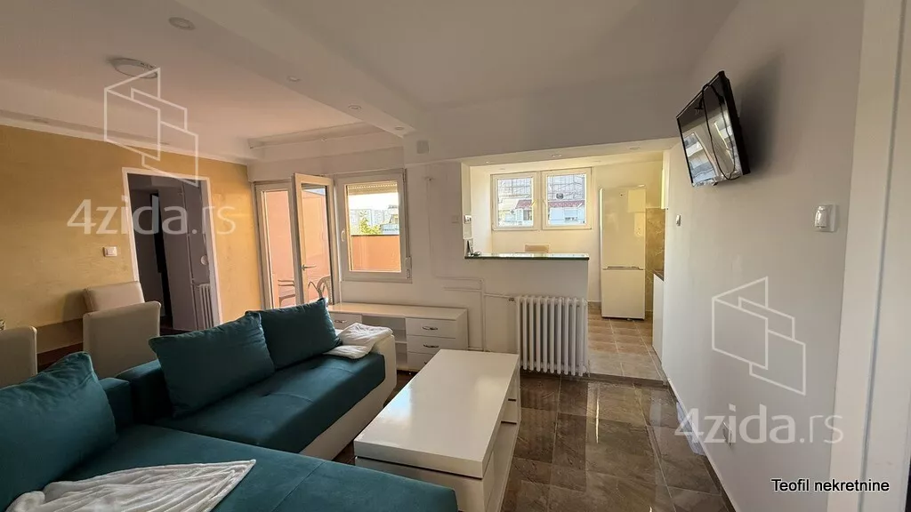 Izdaje se renoviran i kompletno opremljen jednoiposoban stan sa dve lepe terase. Nalazi se na sedmom spratu sedmospratne zgrade sa CG, interfonom, video nadzorom... Ispred stana je i zajednički prostor sa još jednim stanom. Stan je u mirnom delu, okružen zelenilom, u blizini se nalazi Novi Merkator, Arena, Fakultet dramskih umetnosti i Megatrend Univerzitet, kao mini tržni centar, vrtić i Osnovna škola. Veoma svetao I sunčan, dvostrano orjentisan (istok, zapad).