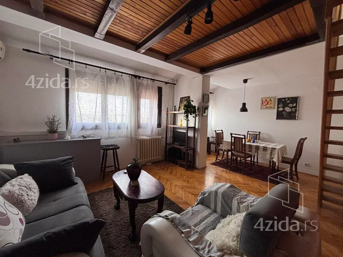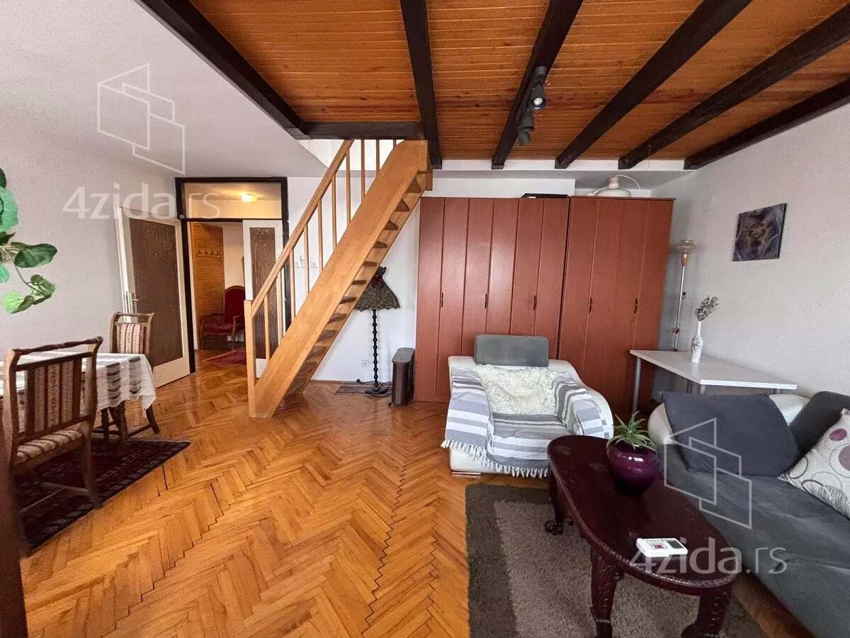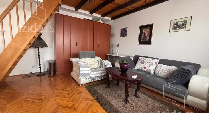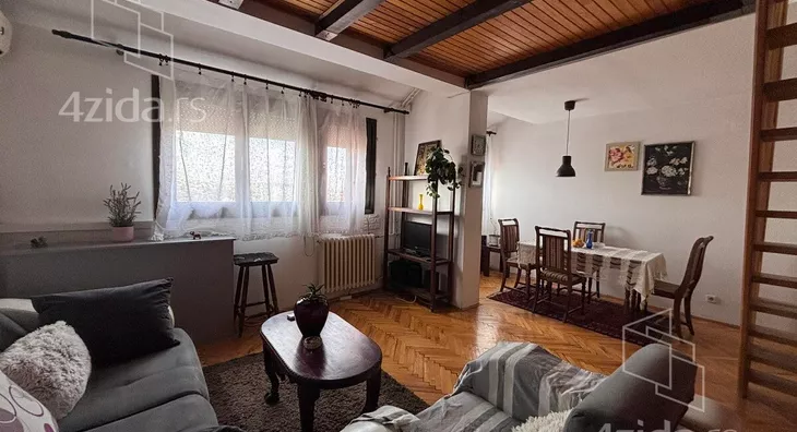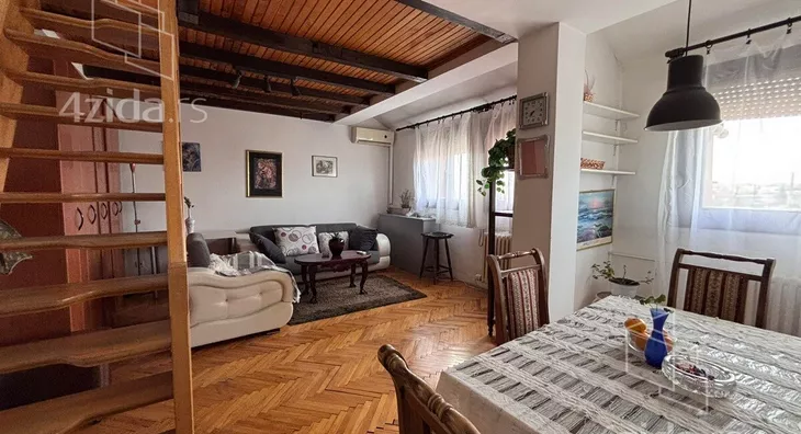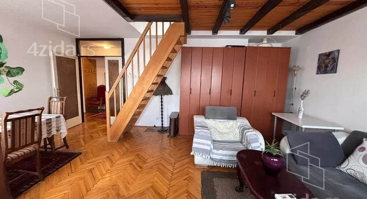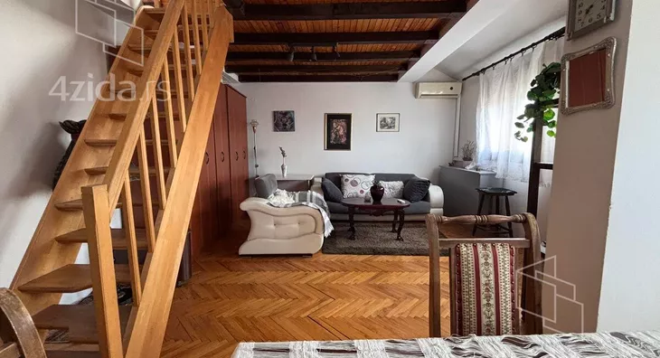 Stan je izuzetno svetao, sa panoramskim pogledom na grad. Nalazi se u održavanoj zgradi sa dva lifta. Površina donjeg nivoa je 47m², a galerije 13m². Sastoji se od hodnika, dnevnog boravka, odvojene kuhinje, kupatila i spavaće sobe na galeriji. Grejanje je na struju – klima i Cini radijatori.