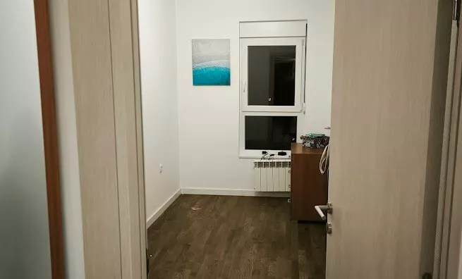 Dvosoban stan koji se sastoji od sirokog ulaznog hodnika /pogodnog za cekaonice/, spavace sobe, dnevnog boravka sa izdvojenom kuhinjom i terasom, kupatilo. Niski troskovi, grejanje na gas. Prostor je pogodan za agencije, knjigovodje, ordinacije ili salone...