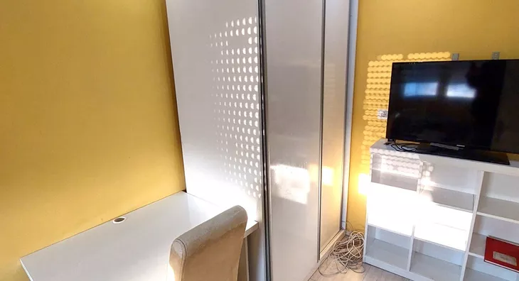 Stan se sastoji od dnevne sobe sa kuhinjom, dve spavaće sobe i kupatila.