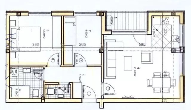 Sastoji se od: dnevnog boravka sa kuhinjom i trpezarijom i izlazom na terasu, dve spavaće sobe, kupatila, toaleta i hodnika.