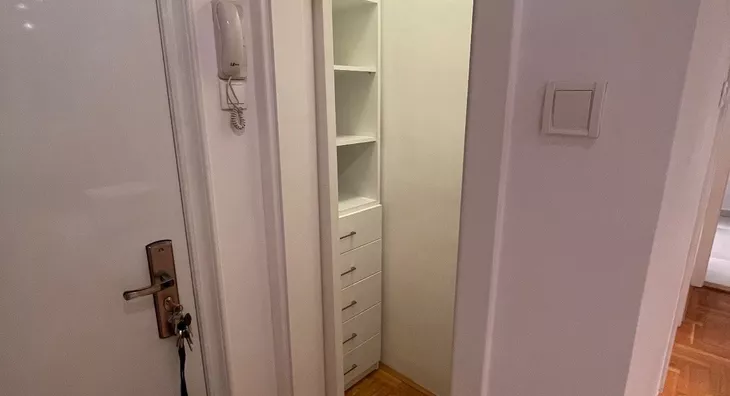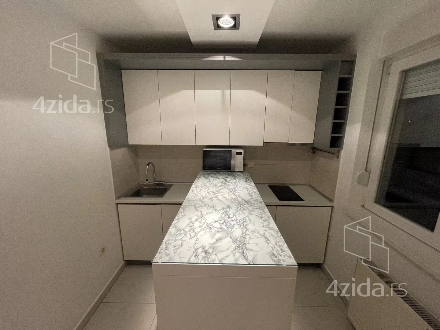 - Opremljenost: Namešteno - interfon, TV, klima, veš mašina, kuhinjski elementi, sudo mašina, frižider, zamrzivač, mikrotalasna rerna, šporet, rerna, ležaj, plakar, ugradni plakar