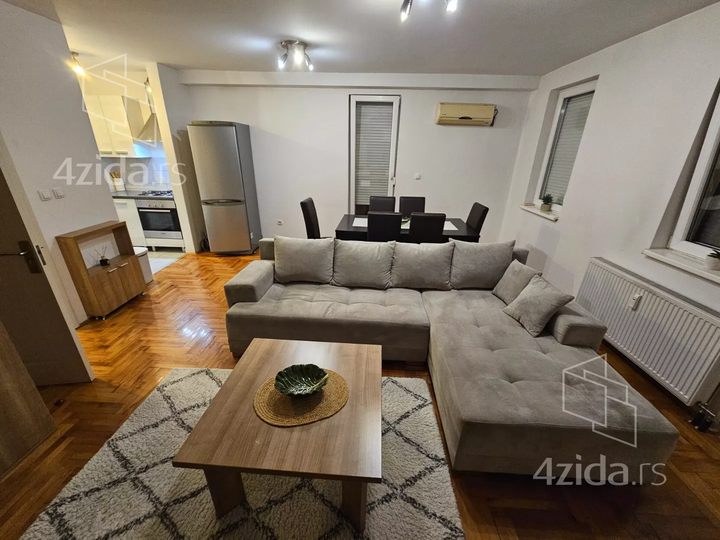 - Opremljenost: Namešteno - TV, klima, veš mašina, kuhinjski elementi, frižider, zamrzivač, šporet, rerna, ležaj, plakar