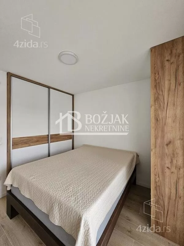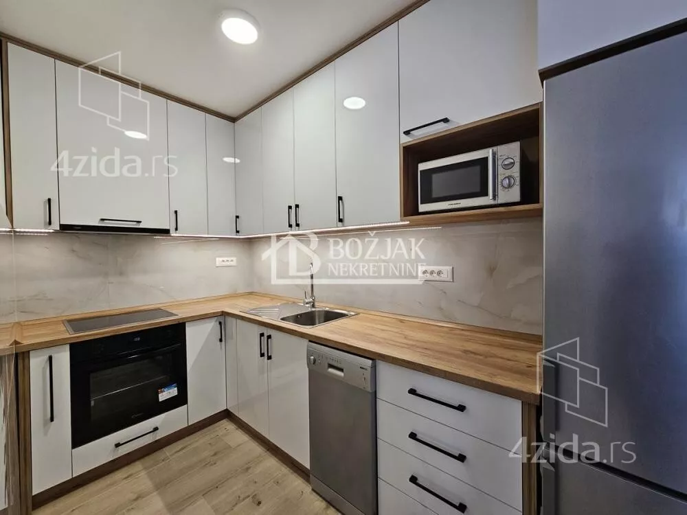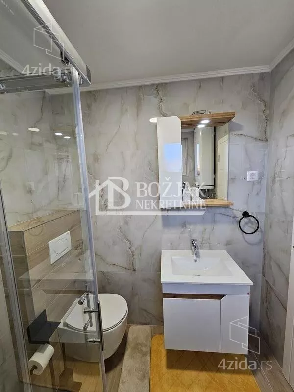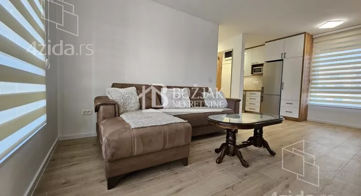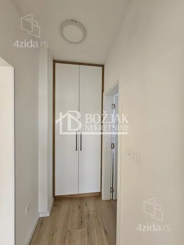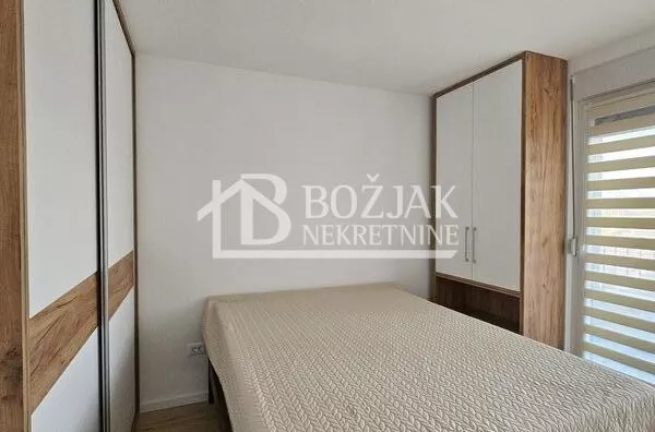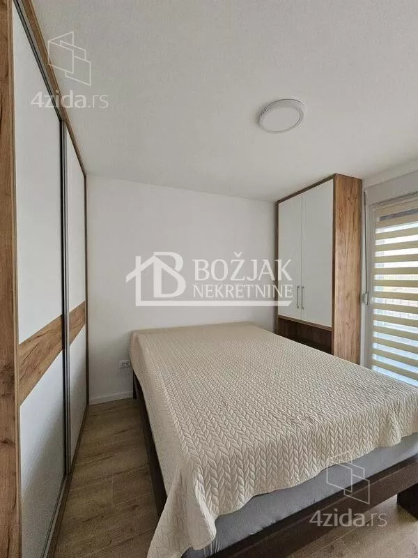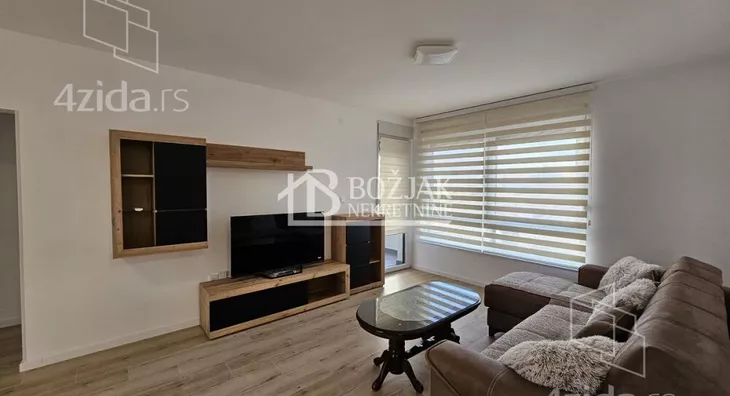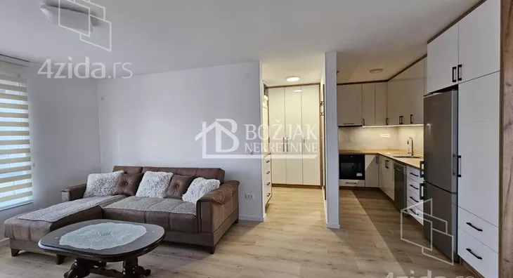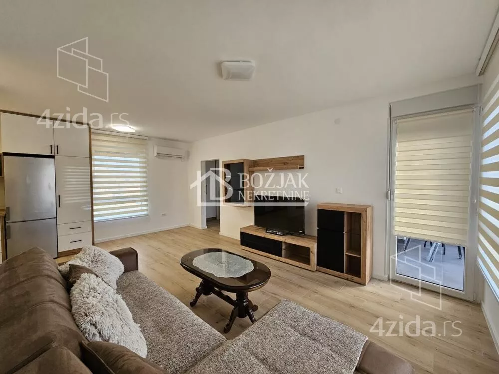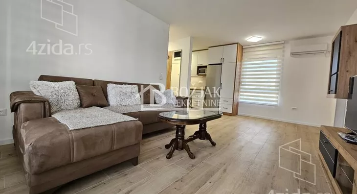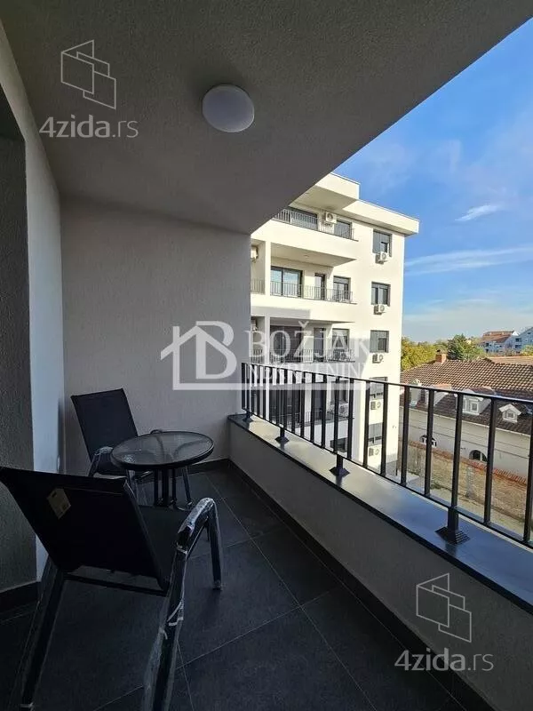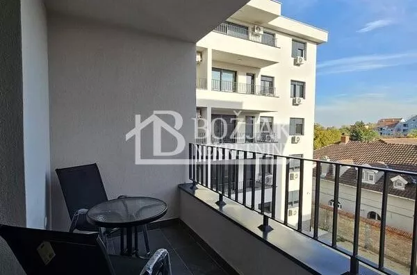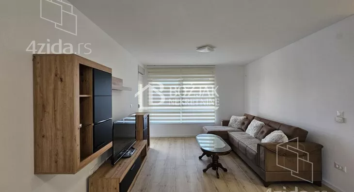 Izdaje se nov, dvosoban stan površine 53m2 na prvom spratu u novoizgrađenoj zgradi sa liftom i interfonom. Stan ima ulaz, izdvojenu kuhinju, trpezariju spojenu sa dnevnom sobom, degažman iz kog se ide u kupatilo i spavaću sobu i terasu na koju se može izaći i iz dnevne i iz spavaće sobe. Stan je namešten kao na slikama, u hodniku je ugradni plakar, čiviluk i ogledalo. Kuhinja je ugradna sa tehnikom-keramička ploča za kuvanje, rerna, aspirator, mašina za pranje sudova, frižider sa zamrzivačem i mikro-talasna. Trpezarisjki sto i stolice su kupljene i očekuje se isporuka, u dnevnoj sobi je ugaona garnitura, klub sto, tv komoda sa TV-om. U degažmanu je plakar, u spavaćoj sobi je bračni krevet sa dva plakara. Na terasi je garnitura - dve fotelje i sto.Stanu pripada obeleženo parking mesto u dvorištu zgrade koje je ograđeno. Grejanje je podno sa termostatima u obe sobe, pa su troškovi niski. Hlađenje je na klimu. U stanu su postavljeni optički kablovi (zakupac obezbeđuje internet i TV paket). Izdaje se sada prvi put, da duži vremenski period (minimum 6 meseci). Depozit je u visini jedne zakupnine. Agencijska provizija je 50% prve zakupnine. Agencijska provizija 50%
