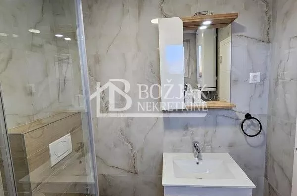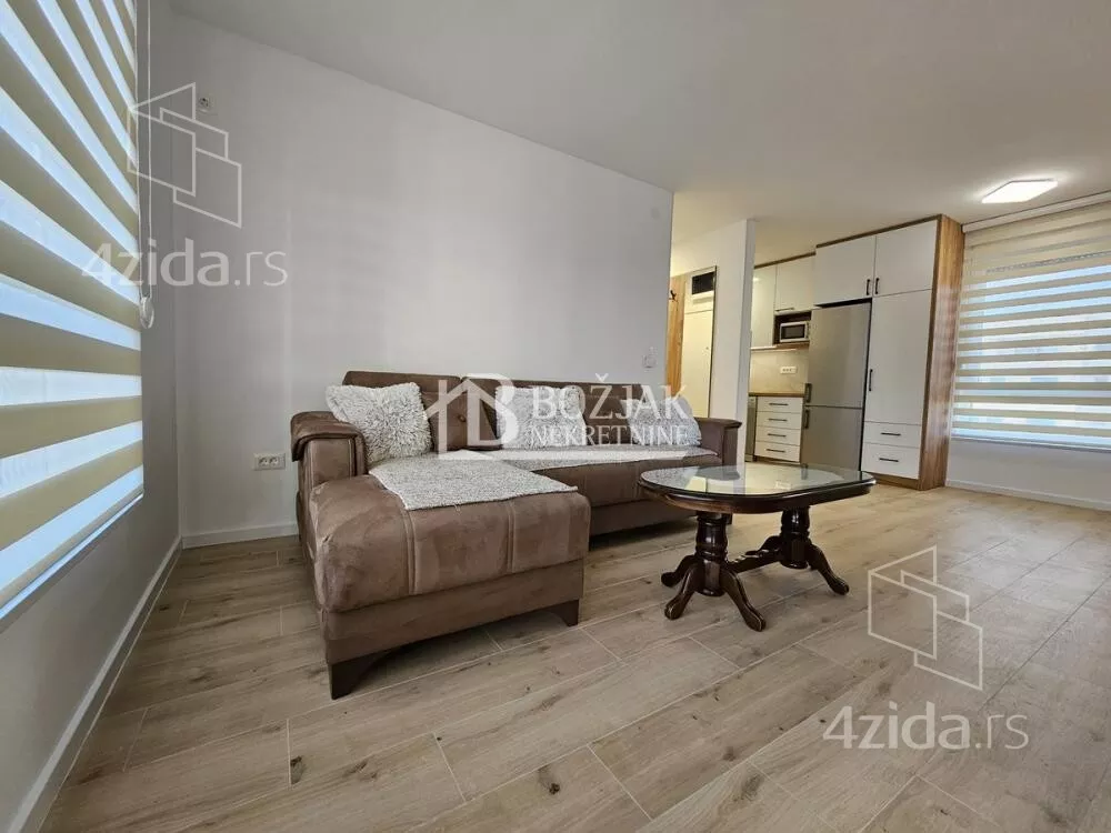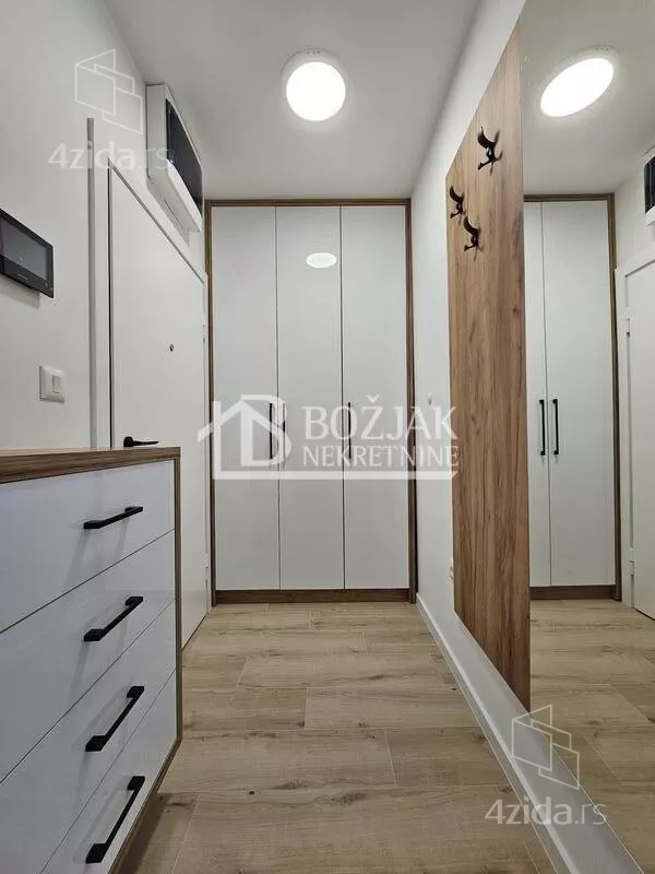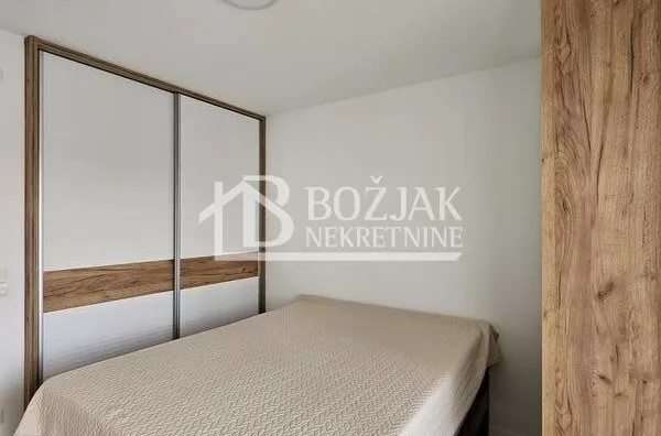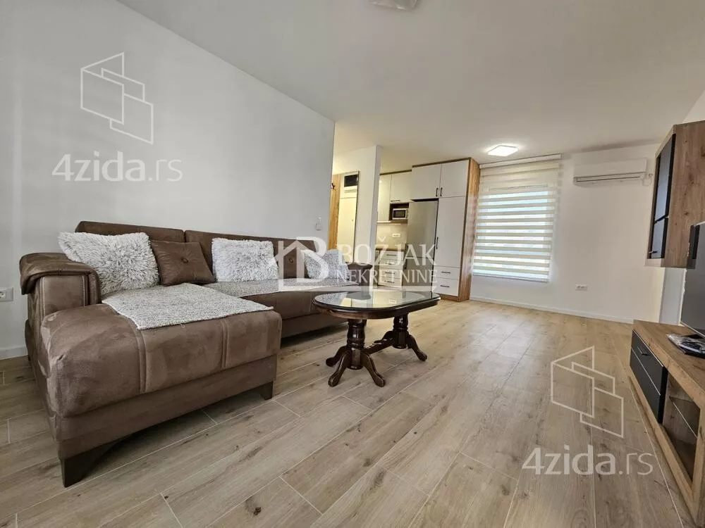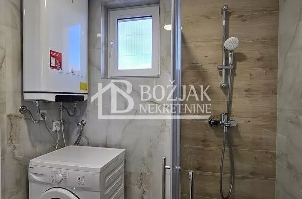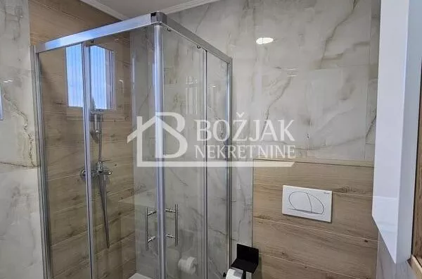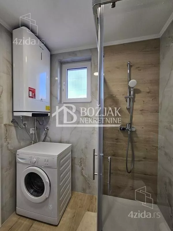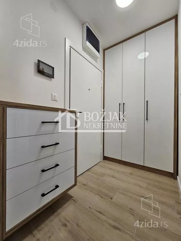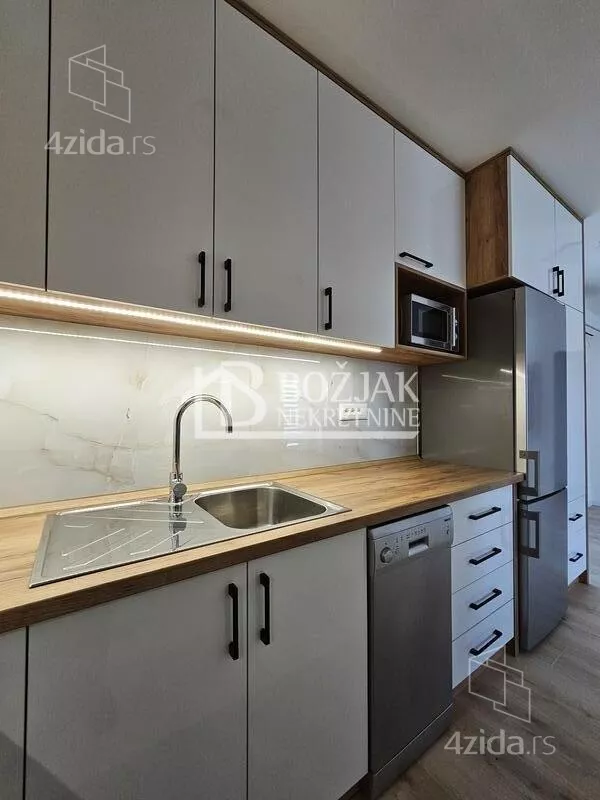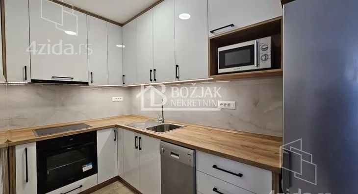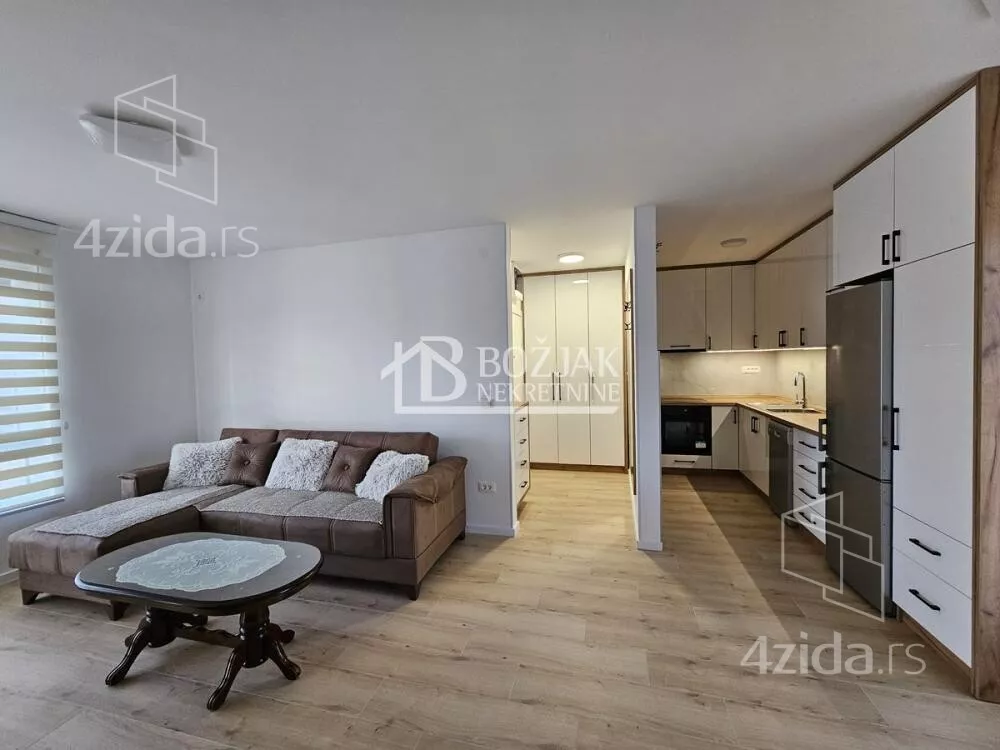 Izdaje se nov, dvosoban stan površine 53m2 na prvom spratu u novoizgrađenoj zgradi sa liftom i interfonom. Stan ima ulaz, izdvojenu kuhinju, trpezariju spojenu sa dnevnom sobom, degažman iz kog se ide u kupatilo i spavaću sobu i terasu na koju se može izaći i iz dnevne i iz spavaće sobe. Stan je namešten kao na slikama, u hodniku je ugradni plakar, čiviluk i ogledalo. Kuhinja je ugradna sa tehnikom-keramička ploča za kuvanje, rerna, aspirator, mašina za pranje sudova, frižider sa zamrzivačem i mikro-talasna. Trpezarisjki sto i stolice su kupljene i očekuje se isporuka, u dnevnoj sobi je ugaona garnitura, klub sto, tv komoda sa TV-om. U degažmanu je plakar, u spavaćoj sobi je bračni krevet sa dva plakara. Na terasi je garnitura - dve fotelje i sto.Stanu pripada obeleženo parking mesto u dvorištu zgrade koje je ograđeno. Grejanje je podno sa termostatima u obe sobe, pa su troškovi niski. Hlađenje je na klimu. U stanu su postavljeni optički kablovi (zakupac obezbeđuje internet i TV paket). Izdaje se sada prvi put, da duži vremenski period (minimum 6 meseci). Depozit je u visini jedne zakupnine. Agencijska provizija je 50% prve zakupnine. Agencijska provizija 50%