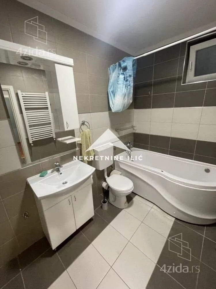 Trosoban stan u blizini centra, površine 68m2, drugi sprat u novosagrađenoj zgradi.Sastoji se od velikog dnevnog boravka sa kuhinjom i trpezarijom, dve spavaće sobe, hodnika, kupatila i terase.Stanu pripada i ostava u suterenu kao i parking mesto u zajedničkoj garaži.Po podovima je tarket, grejanje i hlađenje preko toplotne pumpe (mali mesečni troškovi), stan se izdaje potpuno namešten sa nameštajem i pripadajućom tehnikom.Obavezan depozit u visini jedne mesečne zakupnine. Agencijska provizija 50%
