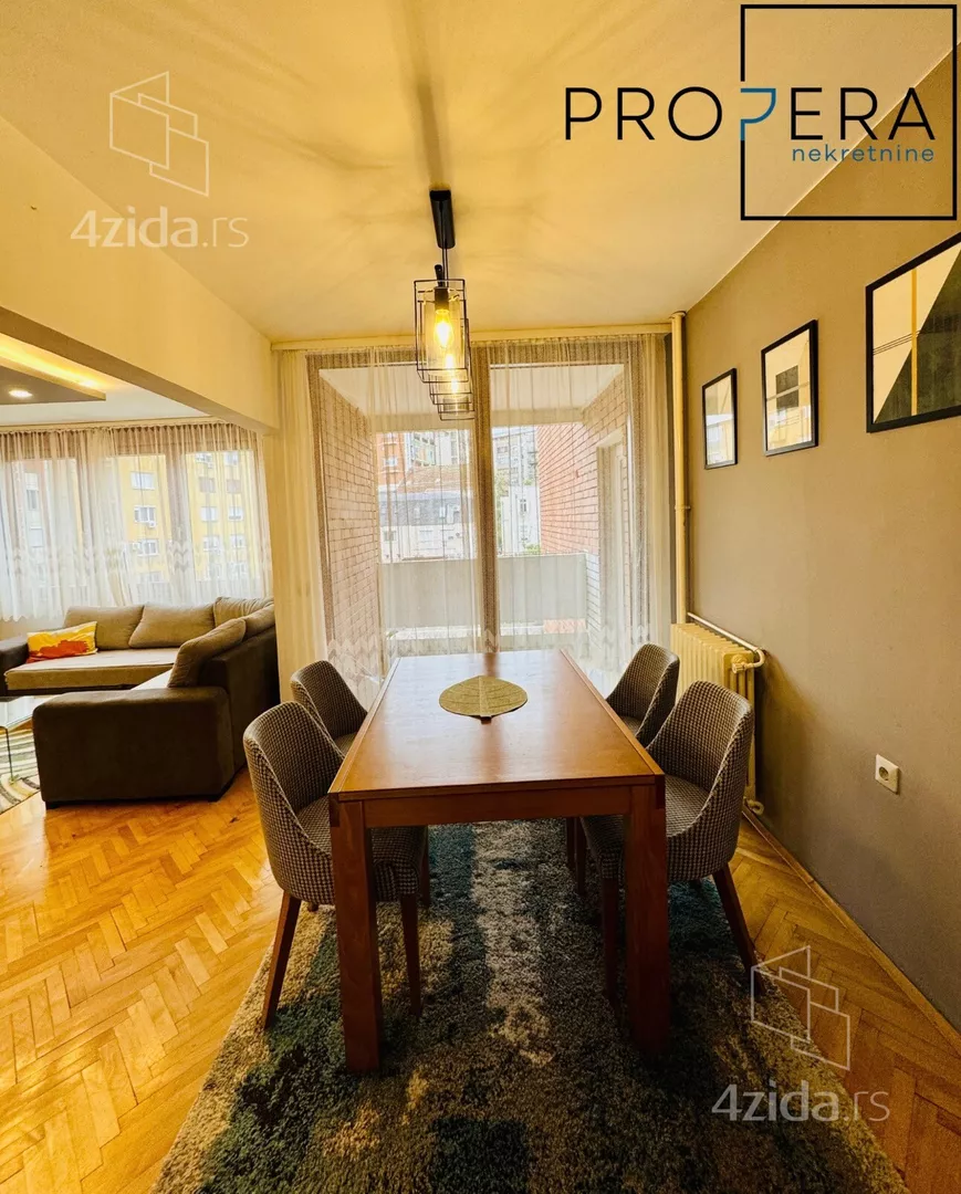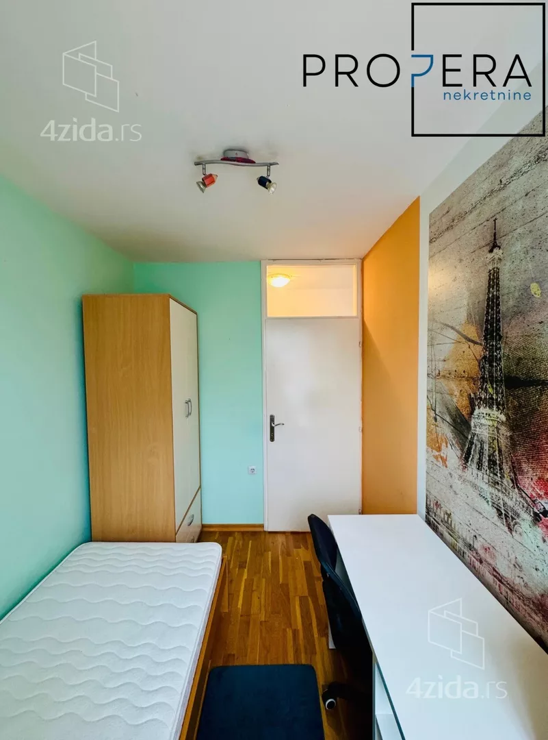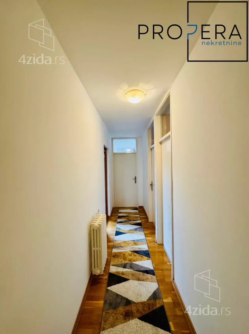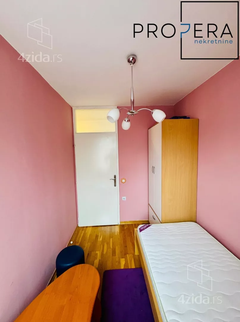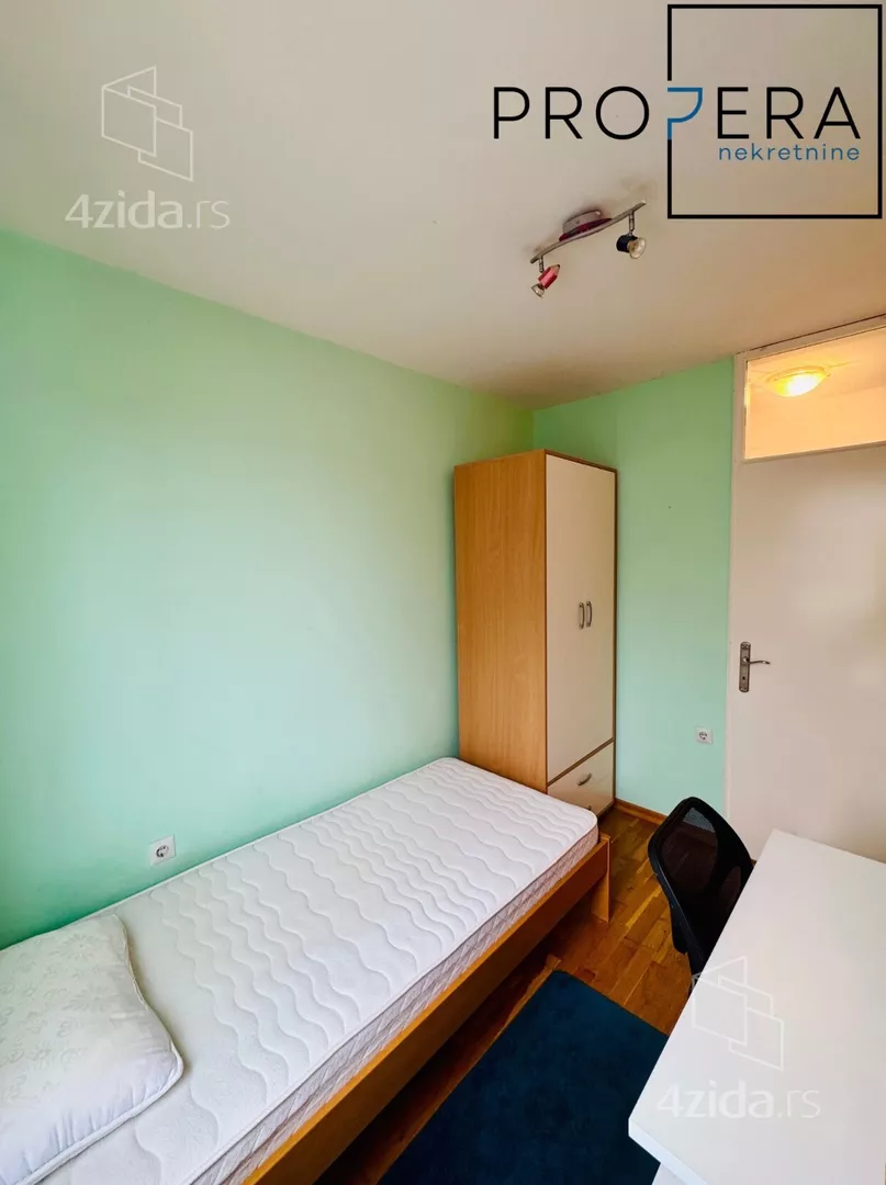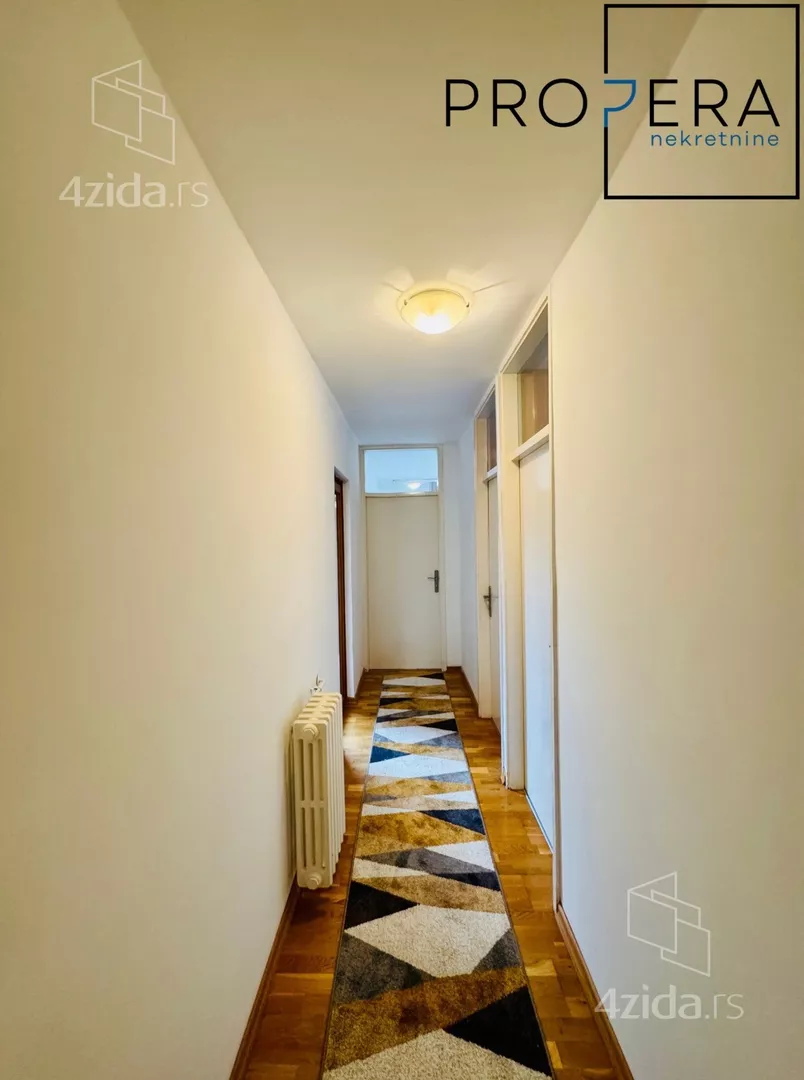 Izdaje se četvorosoban stan, ukupne površine 81 m2. Stan se sastoji od ulaznog hodnika, dnevne sobe sa trpezarijom, kuhinje, tri spavaće sobe, kupatila, toaleta, terase i lođe.