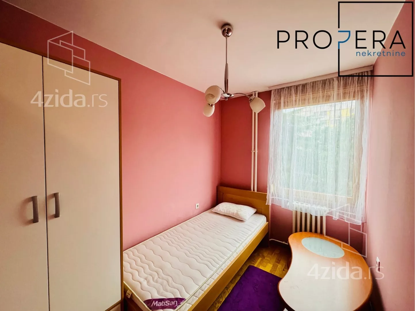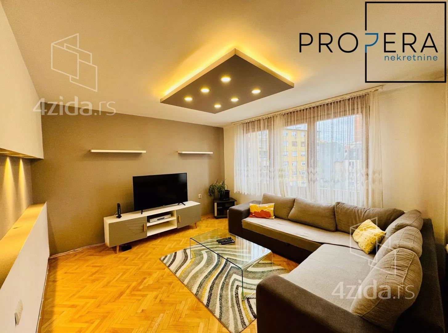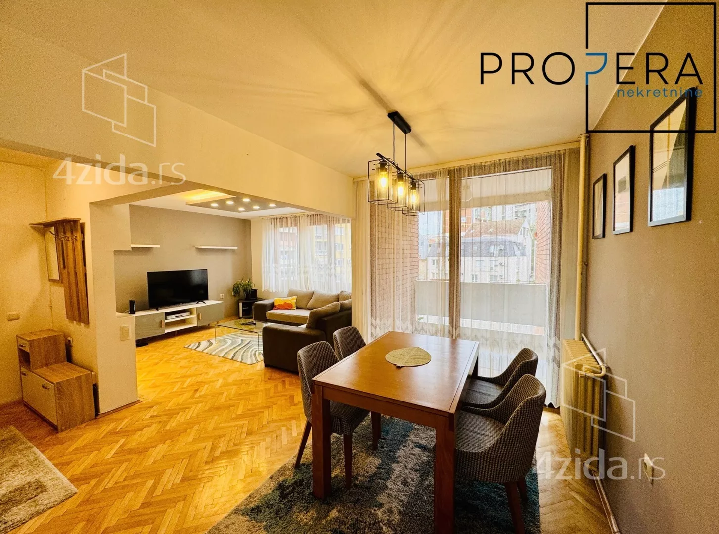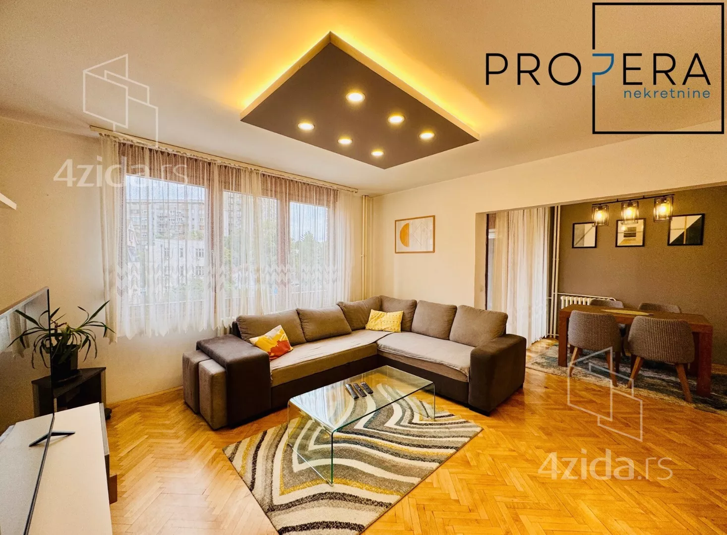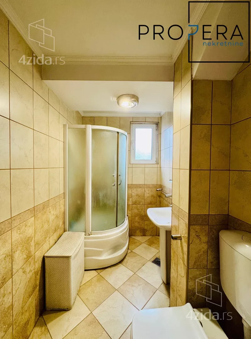 Izdaje se četvorosoban stan, ukupne površine 81 m2. Stan se sastoji od ulaznog hodnika, dnevne sobe sa trpezarijom, kuhinje, tri spavaće sobe, kupatila, toaleta, terase i lođe.