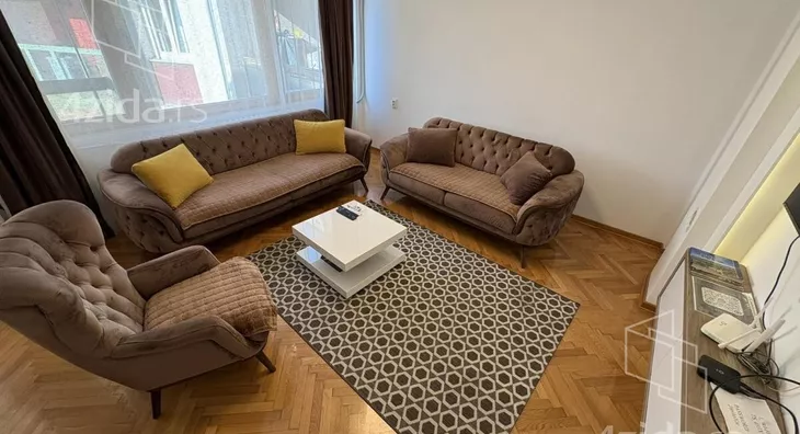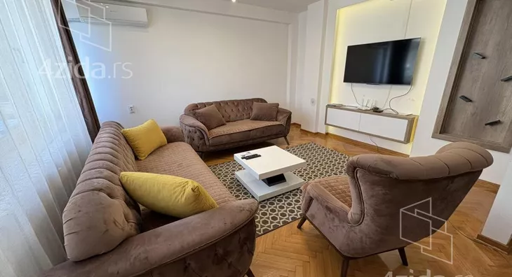 Izdaje se lux trosoban stan u centru grada u neposrednoj blizini Narodnog pozorišta. Stan se nalazi na 7. spratu stambene zgrade sa liftom. Stan je površine 75m2 i sastoji se ulaznog hodnika, prostrane dnevne sobe sa trpezarijom, odvojene kuhinje, degažmana, dve spavaće sobe, kupatila, toaleta i terase. Grejanje je na struju putem norveških radijatora, a ugrađen je inverter klima uređaj. Stan je kompletno renoviran. Parking prostor ispred zgrade je obezbeđen rampom. Stan je na veoma atraktivnoj lokaciji, u mirnoj ulici u centru grada. Nalazi se na samo minut hoda od pešačke zone tako da se u blizini stana nalazi sve što je potrebno za svakodnevni život.