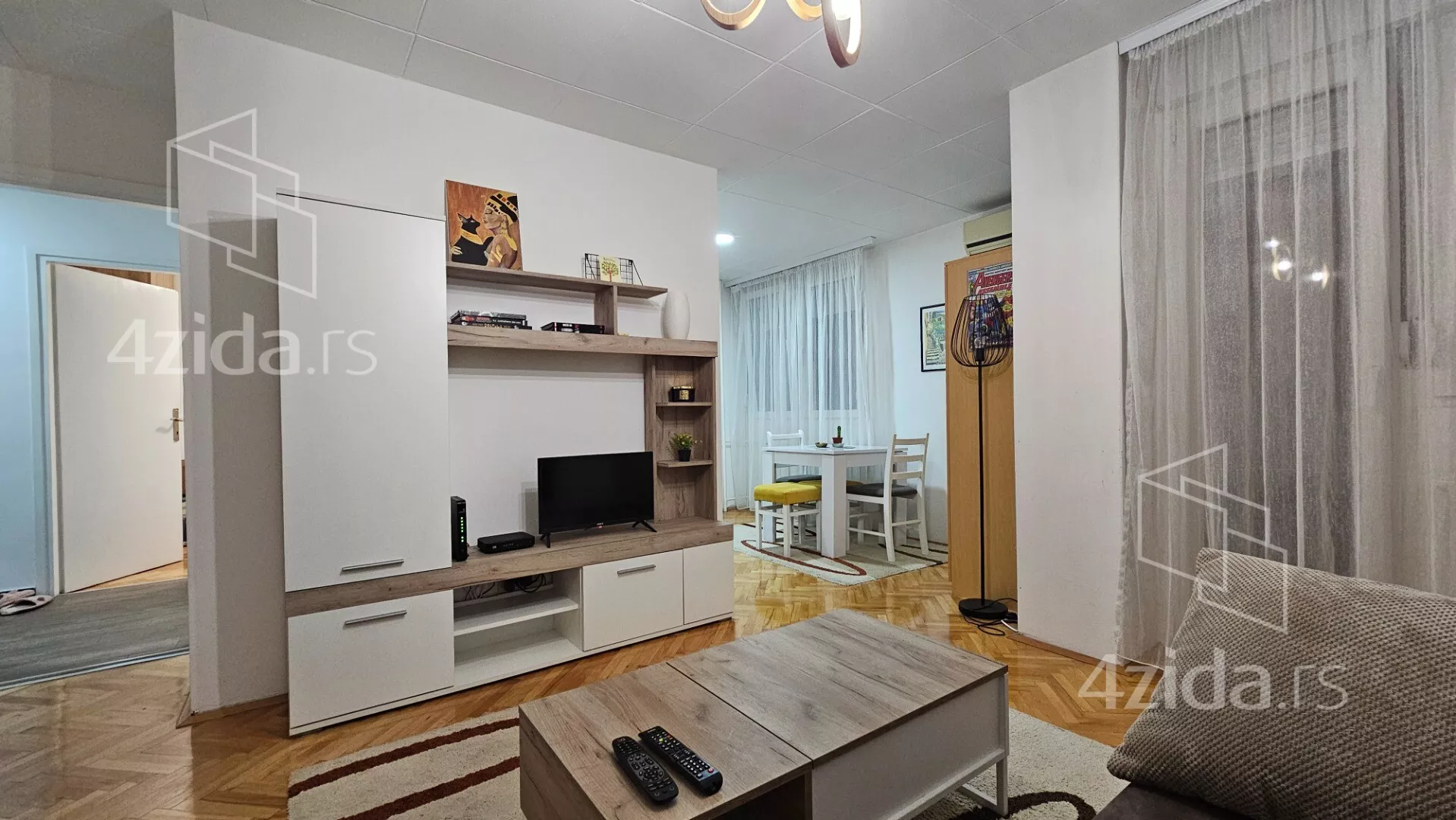 - Opremljenost: Namešteno - internet, TV, klima, veš mašina, kuhinjski elementi, sudo mašina, frižider, zamrzivač, mikrotalasna rerna, šporet, rerna, ležaj, plakar, ugradni plakar