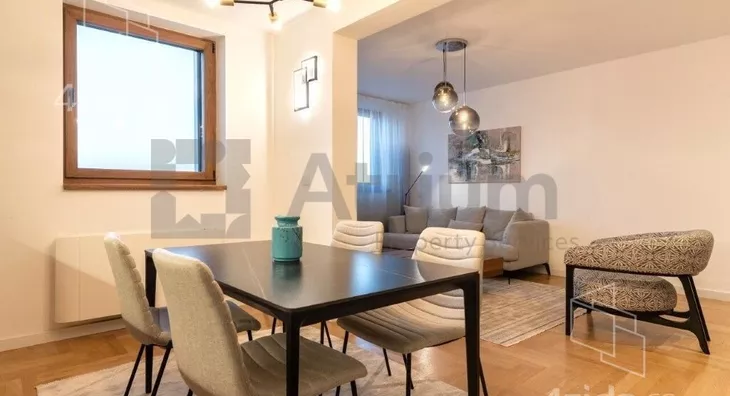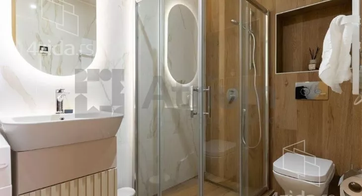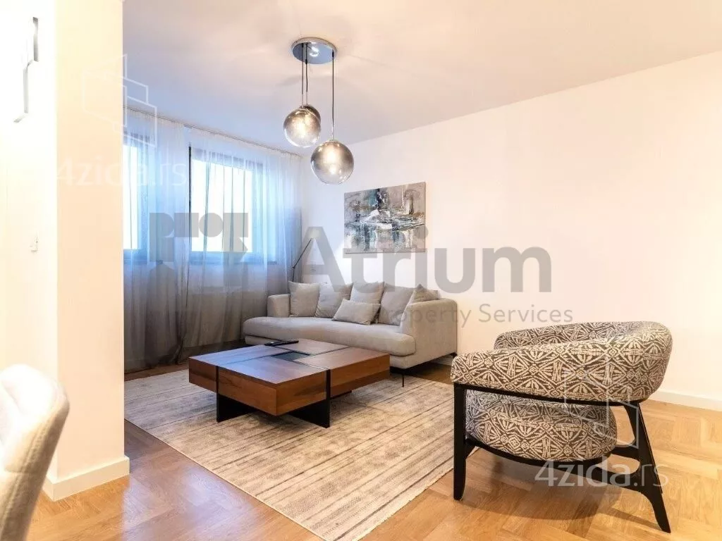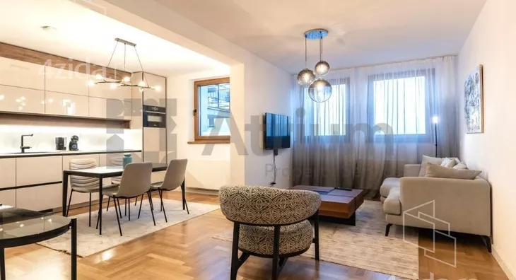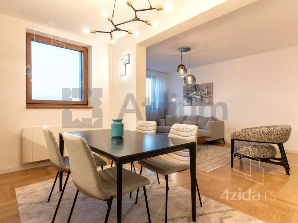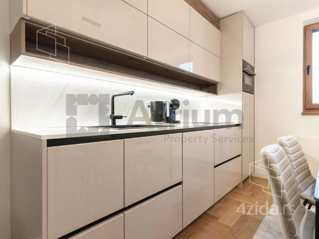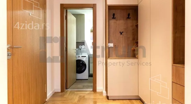 Stan je opremljen savremenim nameštajem, pružajući elegantan i funkcionalan prostor za život. Privatno obezbeđeno parking mesto se dodatno plaća po ceni od 140 EUR.
