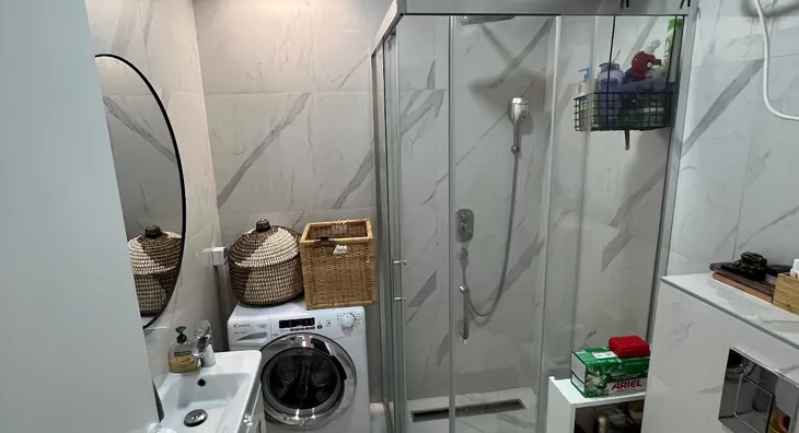 Large windows with aluminum joinery and remote control, as well as mosquito screens, provide plenty of natural light throughout the day. The apartment includes central heating, a washing and drying machine, a dishwasher, and all necessary appliances and furniture for a comfortable stay.