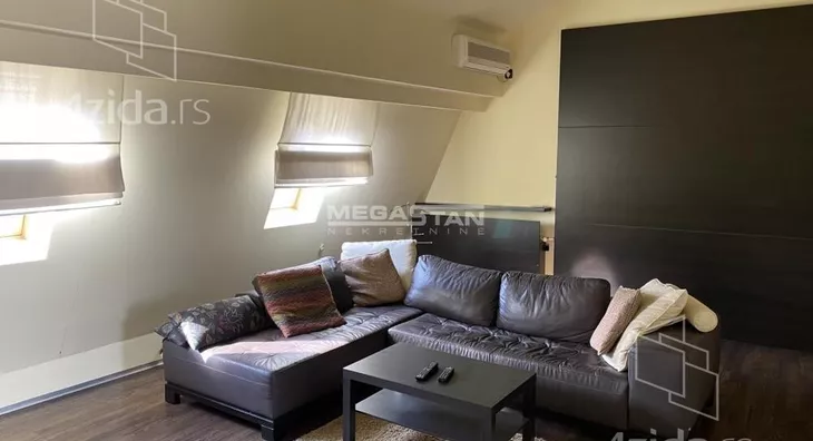 Perfektan, komforan penthouse, duplex, na idealnoj lokaciji - za sve koji vole život u mirnom boemskom, a u pravom srcu grada. Retko u ponudi, izuzetno opremljen, lux, sa lepom terasom orijentisanom ka unutrašnjosti zgrade. Donji nivo: dnevno-trpezarijski deo sa gostinjskim toaletom. Gornji nivo: dve komforne spavaće sobe i ogromno kupatilo sa tuš kabinom i hidromasažnom kadom. Niski režijski troškovi. Obavezan depozit. Agencijska provizija za zakupca 50%. Broj agencije u Registru posrednika 298. Mapa je informativnog karaktera, ne prikazuje tačnu lokaciju nekretnine.