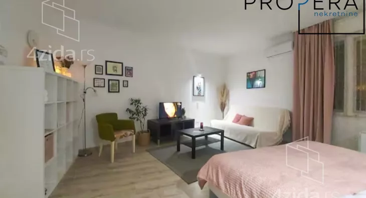 Izdaje se garsonjera, ukupne površine 34 m2. Garsonjera se sastoji od ulaznog hodnika, prostranog dnevnog boravka, kuhinje i kupatila.