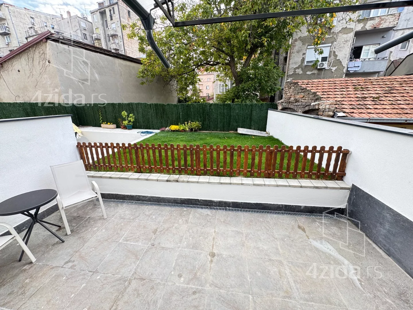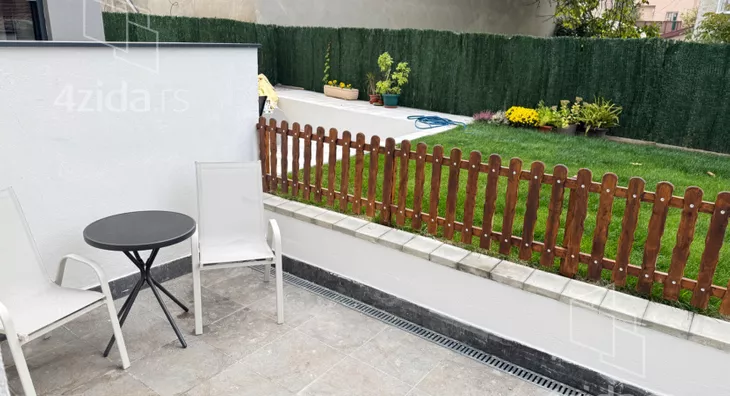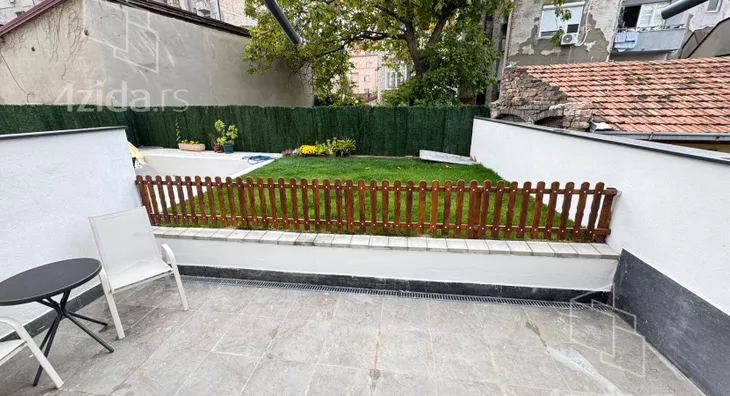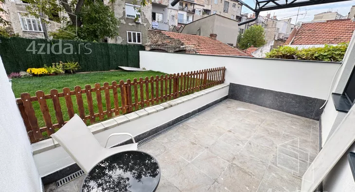 Poseduje podno grejanje, visoke plafone i terasu od 10 m²koja podseća na privatno dvorište.
