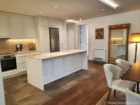 The custom kitchen in matte lacquered cabinetry is fully equipped with Bosch appliances, centered around a functional island that invites both gathering and movement. Materials are considered: warm-toned parquet, large-format ceramics, and a quiet interplay of natural light and shadows.