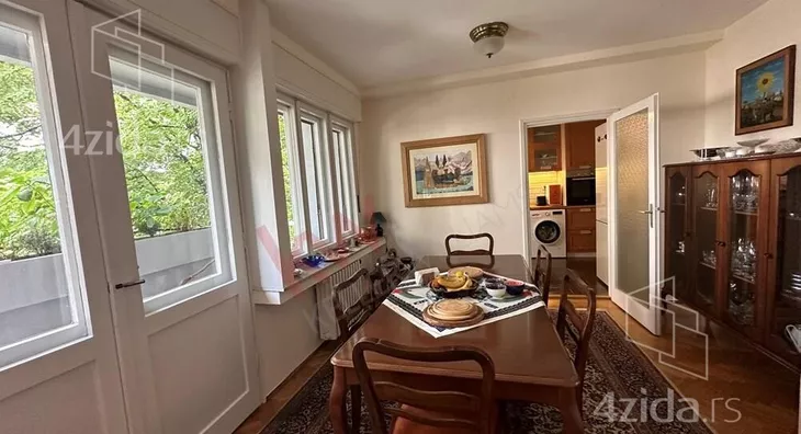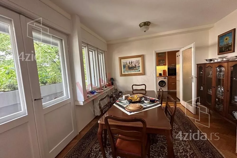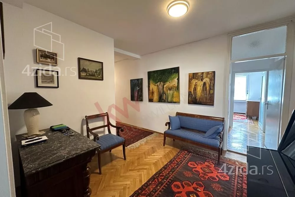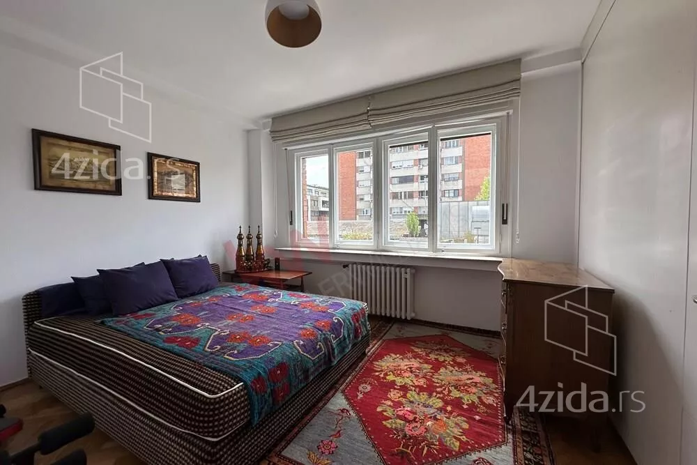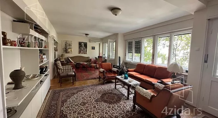 U srcu Vračara, u odličnoj funkcionerskoj zgradi iz 70-tih godina, nudimo petosoban, namešten stan. Dvostrano je orijentisan, veoma svetao i miran.