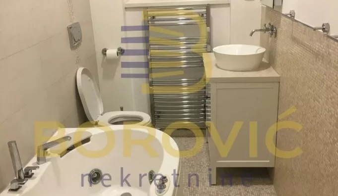 Kupatilo je moderno uređeno, sa hidromasažnom kadom i zanimljivim kružnim prozorom koji unosi karakter u prostor. Poseban toalet dodatno doprinosi komforu. Stan ima dve terase koje pružaju dodatni osećaj prostranosti i mesta za uživanje na otvorenom.