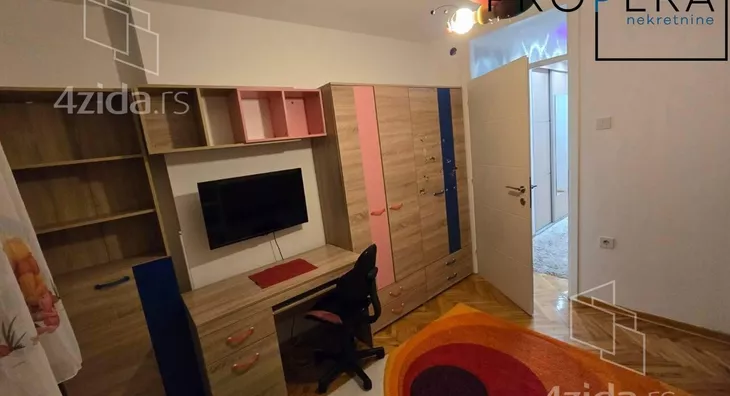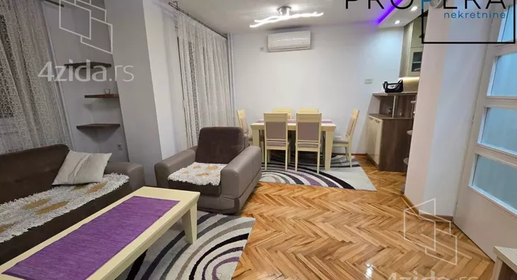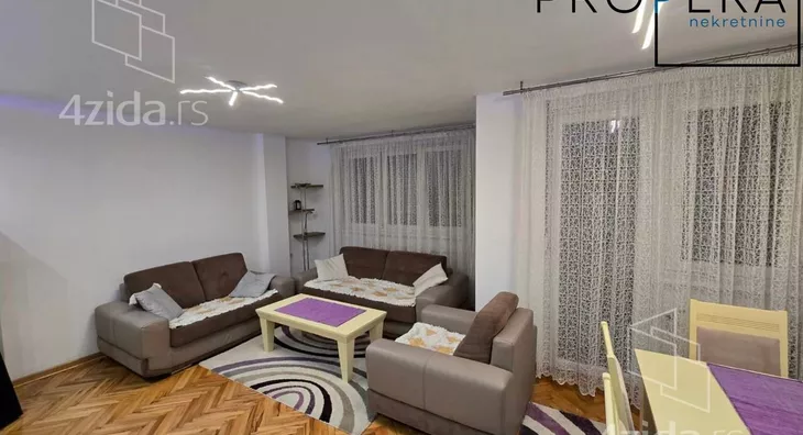 Izdaje se dvoiposoban stan, ukupne površine 74 m2. Stan se sastoji od ulaznog hodnika, prostrane dnevne sobe sa trpezarijom i kuhinjom, dve spavaće sobe, kupatila, toaleta i terase.