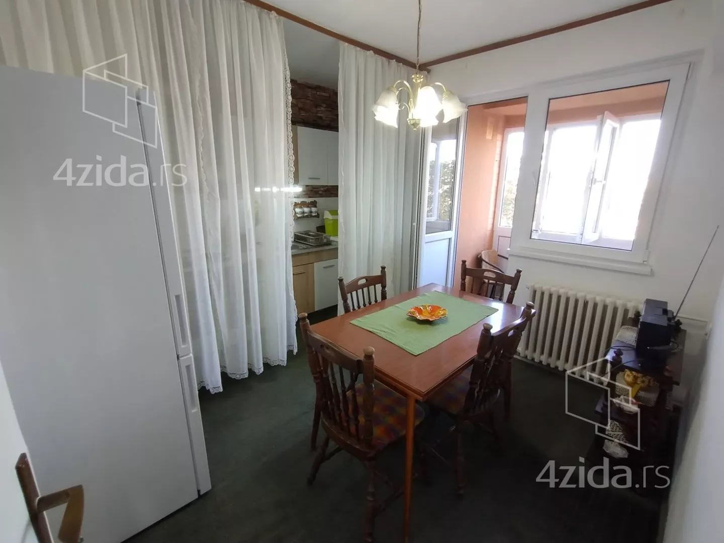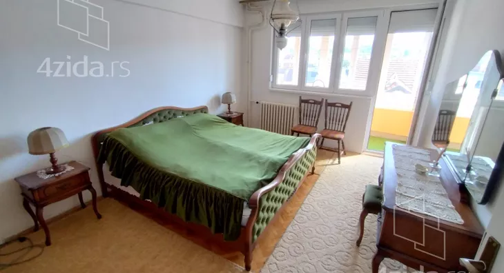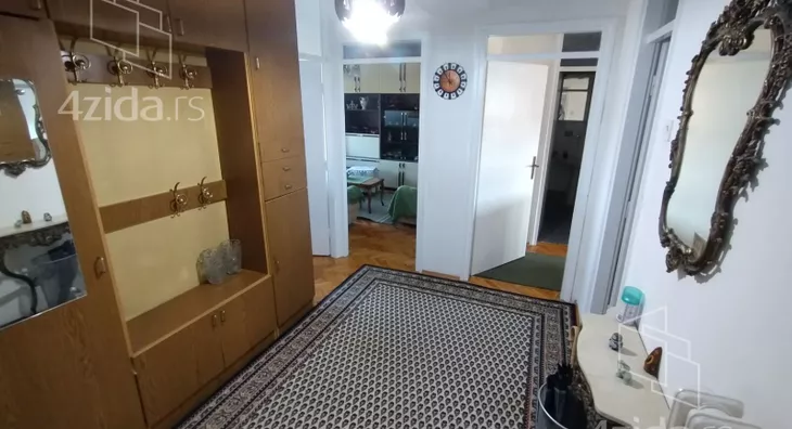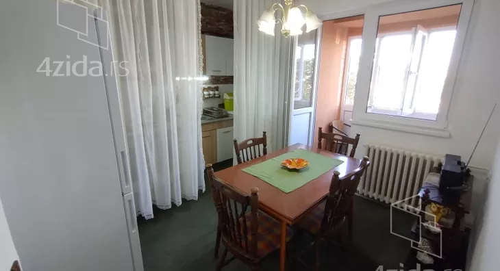 Stan je smešten na 5. spratu zgrade koja poseduje dva lifta i prostire se na površini od 75m2 (bez terasa). Po strukturi je funkcionalan i sastoji se od ulaznog hodnika, tri odvojene sobe, kuhinje sa trpezarijom, predsoblja, kupatila, posebnog toaleta, dve zastakljene terase i špajza. Bracni krevet poseduje novi dušek i naddušek, kuhinjski elementi i frižider su takođe novi.