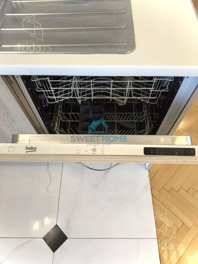 - Opremljenost: Namešteno - internet, interfon, TV, klima, veš mašina, sudo mašina, frižider, rerna, ležaj, plakar