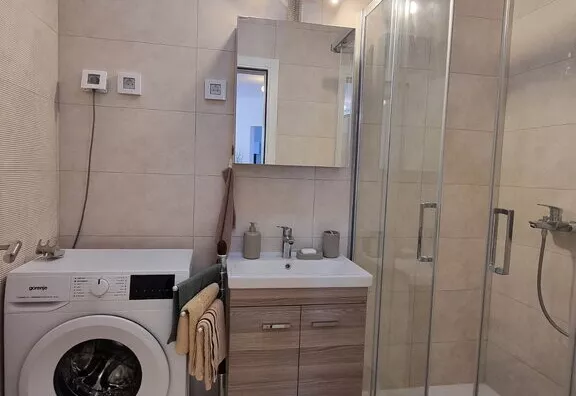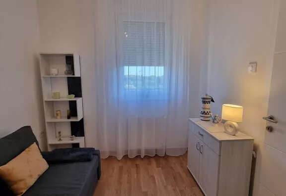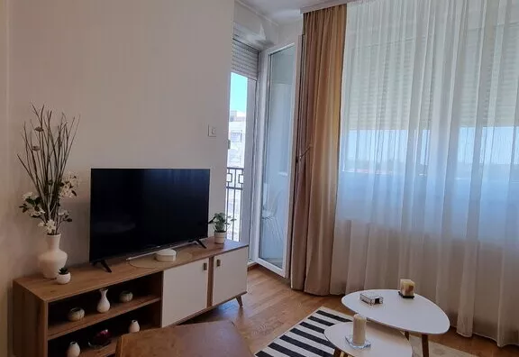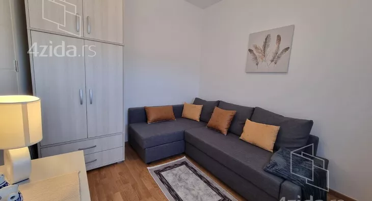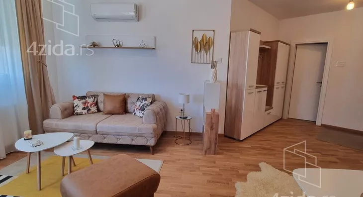 Izdaje se dvosoban stan od 43m2 koji se nalaza u novosagrađenoj zgradi na 5/5 spratu u zgradi sa lifta. Sastoji se od dnevnog boravka sa trpezarijom i kuhinjim koji vodi na terasu koja je istočno orjentisana. Na podovima je parker, prozori su PVC, a grejanje je na gas. Stan je moderno opremljen i ima obezeđeno parkog mesto u dvorištu zgrade. Obavezan depozit u visini jedne kirije, minimalni najam 6 meseci za nepušače , bez kućnih ljubimaca.