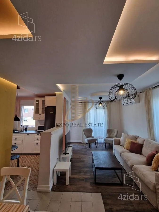 - Opremljenost: Namešteno - internet, interfon, TV, klima, veš mašina, sudo mašina, frižider, rerna, ležaj, plakar