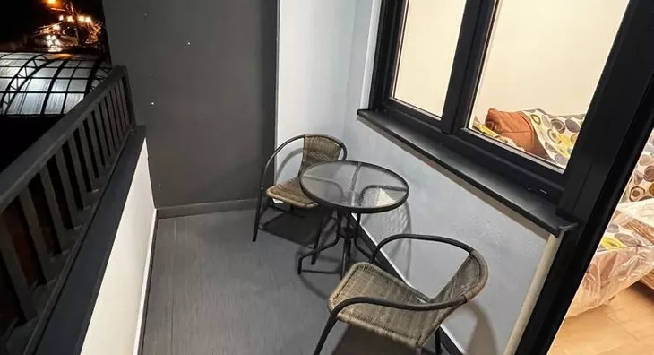 Prostor je nov i namešten sa podnim grejanjem. Stan ima kupatilo, toalet, kuhinju i terasu sa pogledom na ulicu. Opremljen je novim nameštajem i aparatima uključujući TV, klimu, veš mašinu, kuhinjske elemente, frižider, zamrzivač, rernu, šporet, ležaj i plakare. Stan poseduje tendu, roletne i komarnike.