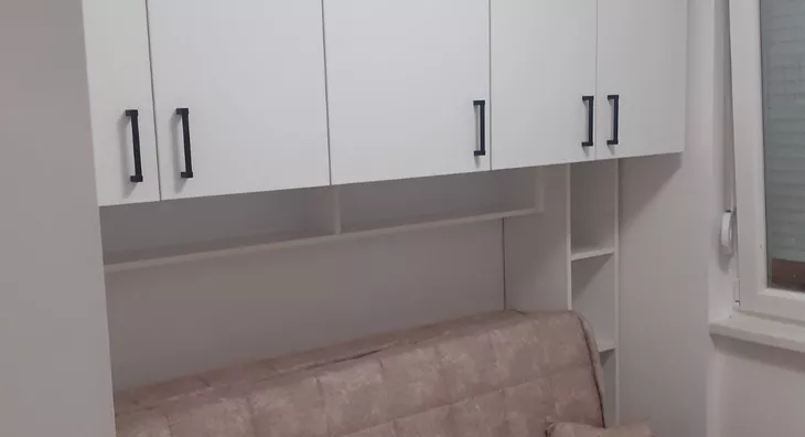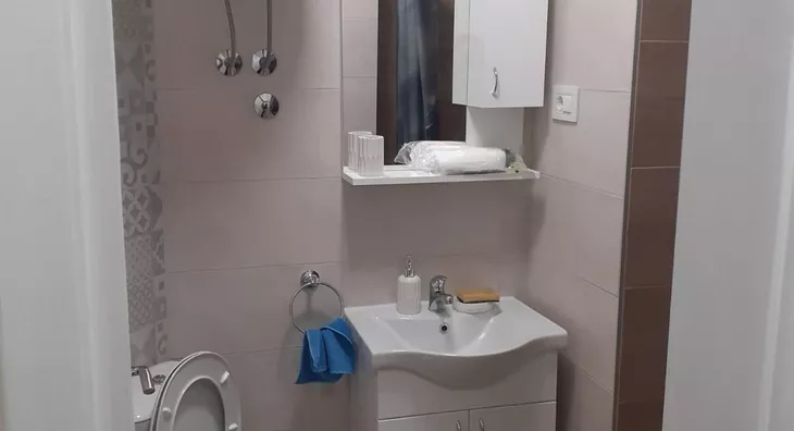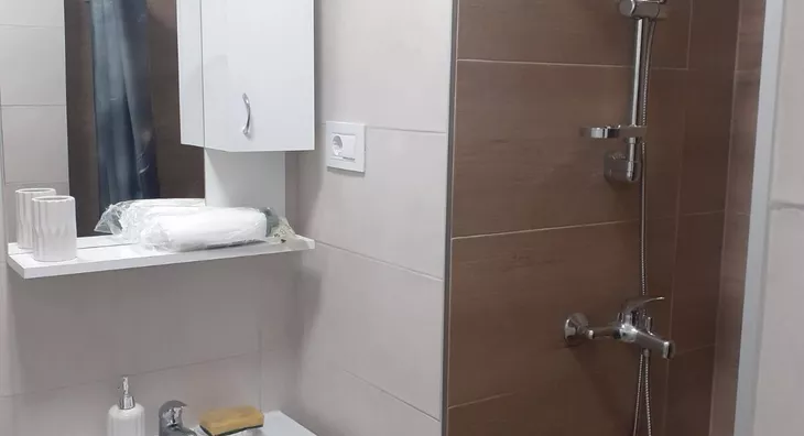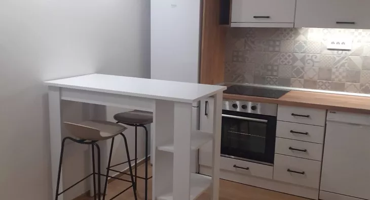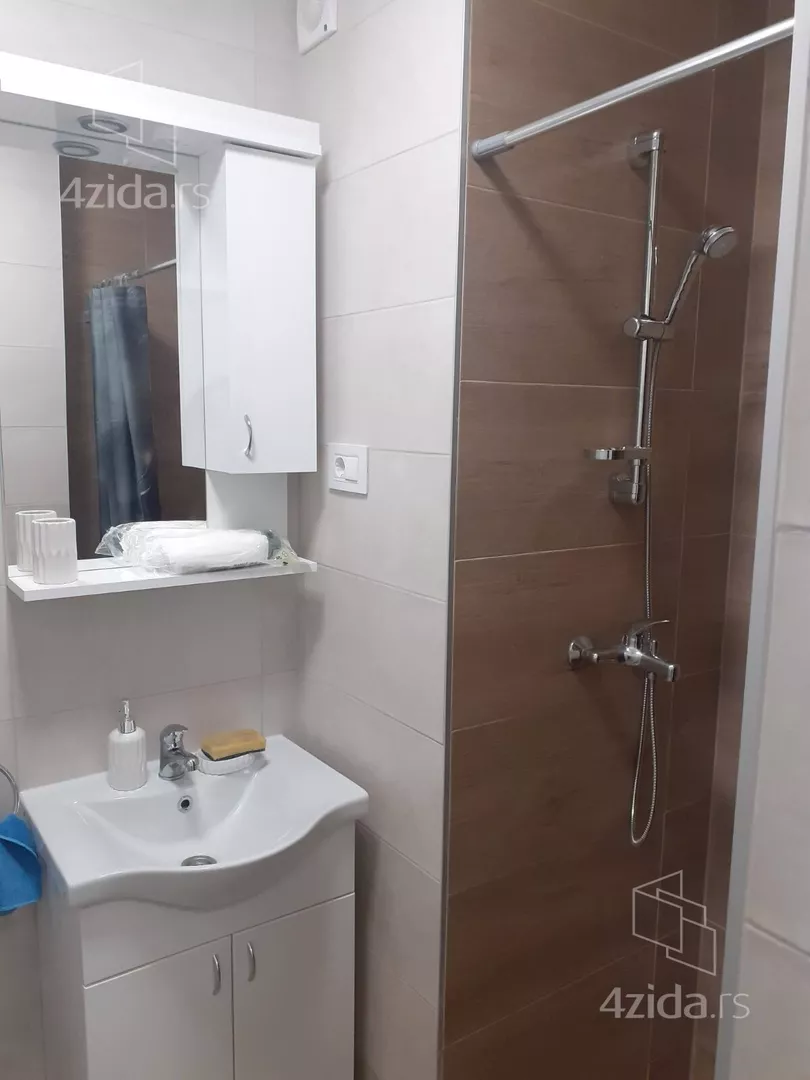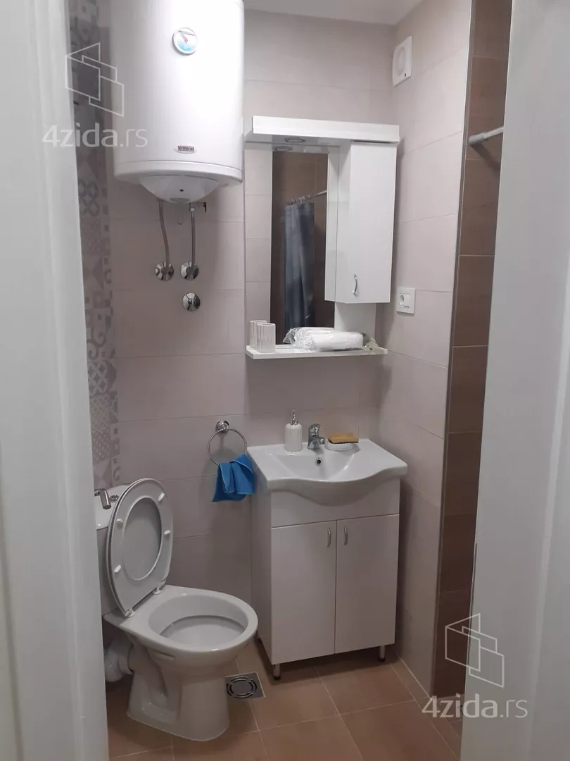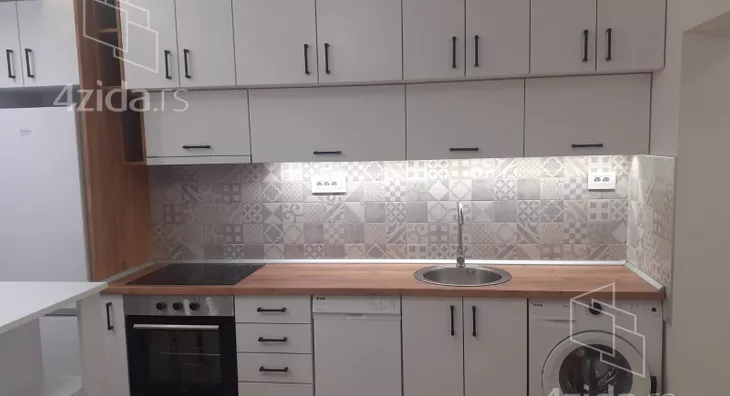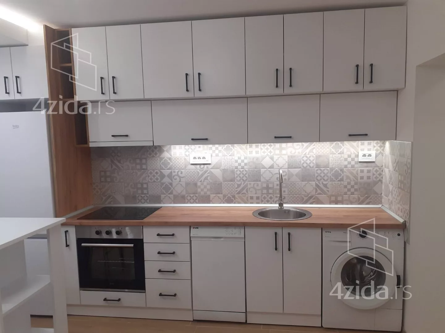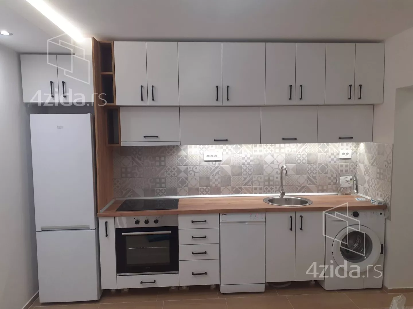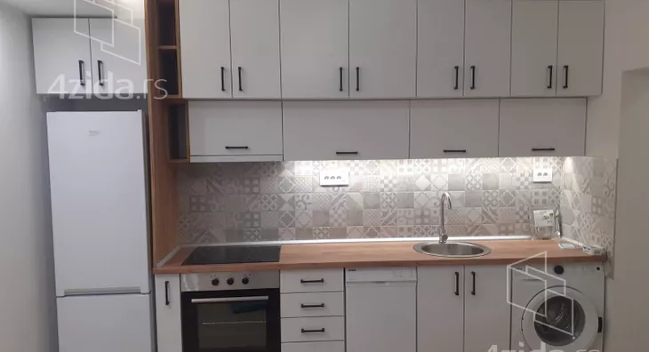 - Opremljenost: Namešteno - TV, klima, veš mašina, kuhinjski elementi, frižider, zamrzivač, mikrotalasna rerna, šporet, rerna, ležaj, plakar, ugradni plakar