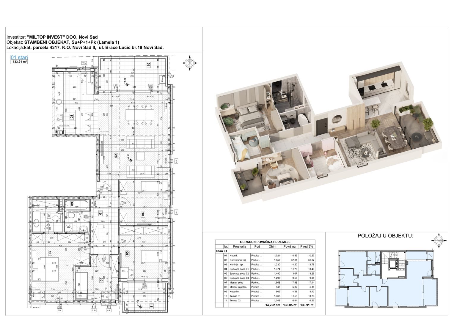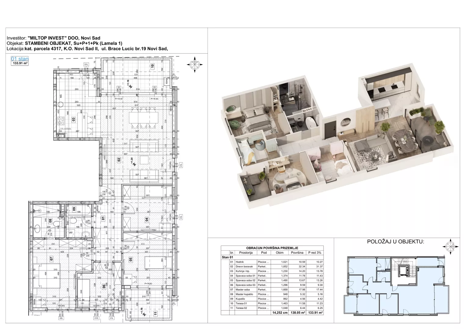 Objekat ima tri etaže i pažljivo je projektovan da svakom stanu obezbedi komfor i privatnost. Prizemni stan poseduje sopstveno dvorište od okvirno 50 m², dok penthouse nudi krovnu terasu od čak 170 m². U suterenu se nalaze prostrane ostave od 15 do 25 m², a u dvorištu natkrivena parking mesta dostupna za kupovinu.