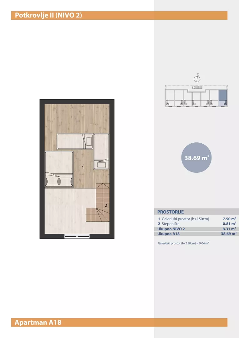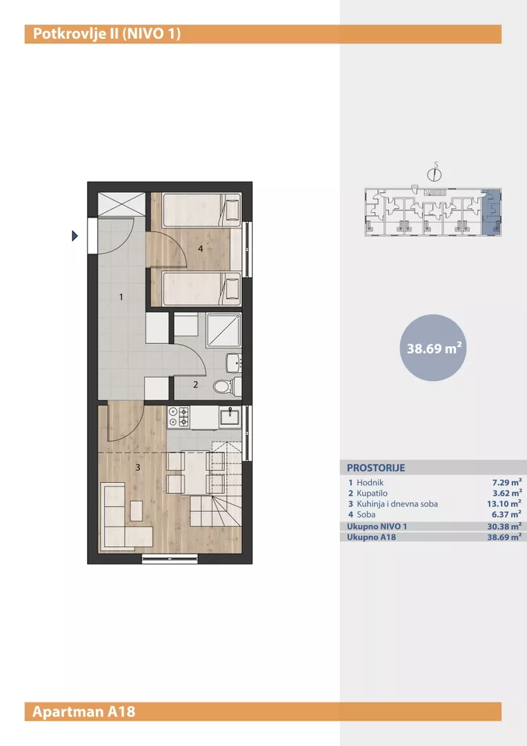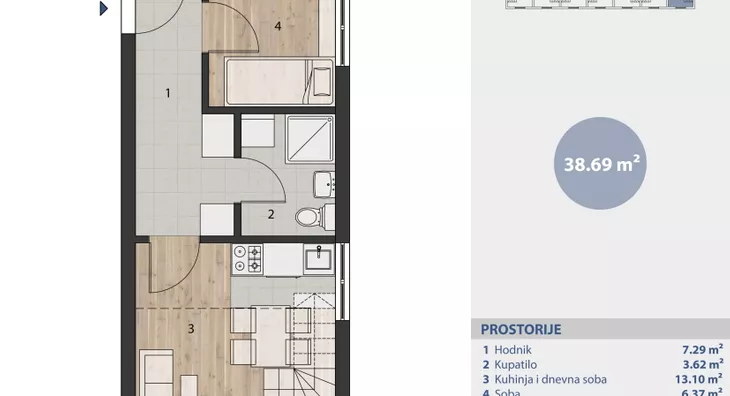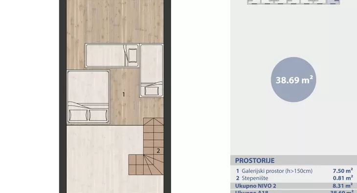 Sve to stvara živopisno i aktivno okruženje koje kombinuje udobnost, funkcionalnost i visok turistički potencijal – kako za odmor, tako i za investiciju. U ponudi je lux stambeno-poslovni objekat sa smeštajnim kapacitetom od 24 apartmana i dva lokala, koji ispunjava sve najsavremenije standarde izgradnje: Spoljna demit fasada i unutrašnja izolacija kamenom vunom Prvoklasna PVC stolarija sa ALU roletnama Kupatila i kuhinje sa kvalitetnom podnom i zidnom keramikom Tarkett–parket u svim prostorijama Etažno grejanje Parking mesta ispred objekta (kupuje se posebno) U ponudi je i apartman dupleks, jednoiposobne strukture, koji se nalazi u potkrovlju objekta i prostire se na dva nivoa. Prvi nivo čine ulazni hodnik, kupatilo, dnevni boravak sa kuhinjom i trpezarijskim delom, dok stepenice postavljene u uglu dnevne sobe vode na galeriju gde je predviđena spavaća soba. Završetak radova i mogućnost useljenja planirani su do kraja 2026. godine. Napomena: prikazani rasporedi nameštaja su ilustrativni i predstavljaju samo jedan od mogućih predloga uređenja prostora – kupci imaju potpunu slobodu organizacije u skladu sa sopstvenim željama i potrebama.