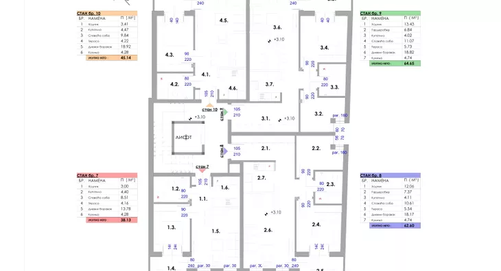 Stan broj 10 koji je površine 45.14 m2 sa sledećom strukturom: hodnik 3.41 m2, kupatilo 4.47 m2, spavaća soba 1 9.84 m2, terasa 4.22 m2, dnevni boravak 18.92 m2, kuhinja 4.28 m2.