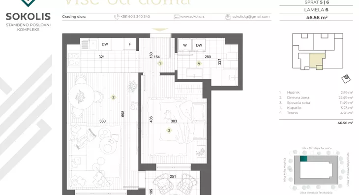 Lokacija: Erdoglija, Kragujevac. Sokolis, stambeno-poslovni kompleks, smešten je na zelenoj lokaciji, udaljenoj samo 15 minuta hoda od centra Kragujevca. Pozicioniran u prestižnom naselju Erdoglija, Sokolis pruža savršen spoj urbanih pogodnosti i prirodnog okruženja. Ovo područje, poznato kao "grad u gradu", obiluje poslovnim centrima, kulturno-istorijskim znamenitostima i gustim zelenilom. Sokolis je smešten preko puta stare Sokolane, koja datira iz 1929. godine i predstavlja simbol ovog dela grada. Sokolana, s originalnom drvenom arhitekturom, danas je kulturno dobro od izuzetnog nacionalnog značaja. Uokvirena vrtom s muzičkim paviljonom i spomenikom Kralja Aleksandra I Karađorđevića, Sokolana pruža stanovnicima Erdoglije osećaj nasleđivanja bogate kulturne tradicije. Sokolis se nalazi na obronku Spomen-parka Šumarice, prostora od preko 350 hektara održavanog zelenila sa deset spomenika i muzejom "21. oktobar". Ova oaza, proglašena kulturnim dobrom od izuzetnog nacionalnog značaja, nudi staze za šetnju i trčanje, pružajući jedinstvenu povezanost sa istorijskim nasleđem. Sokolis nudi okolinu u kojoj su susedi mladi naučnici Univerziteta u Kragujevcu. Građevinsko preduzeće Grading je angažovalo akademske slikare kako bi stvorili vizuelno jedinstven kvart. Lokacija blizu kragujevačkog hipodroma dodatno pridonosi ekskluzivnosti, omogućavajući aktivnosti poput jahanja i vožnje fijakerom. Sokolis je okružen osnovnom školom, vrtićima, restoranima, trgovinama i najvećim tržnim centrom u gradu. Blizina Bulevara Kraljice Marije olakšava pristup prometnim saobraćajnicama, pružajući praktičnost u organizaciji svakodnevnih aktivnosti. Osim toga, uzvišen položaj Erdoglije pruža predivan pogled na panoramu Kragujevca, a zgrada Sokolisa ističe se na horizontu, čineći ovu lokaciju jedinstvenim spojem prošlosti i budućnosti.