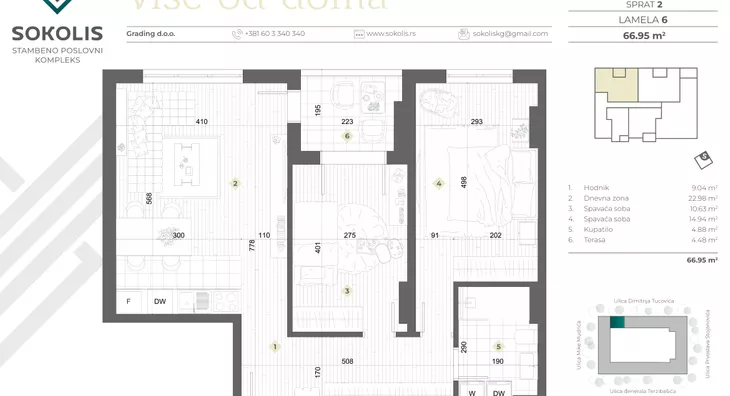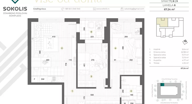 Lokacija: Erdoglija, Kragujevac. Sokolis, stambeno-poslovni kompleks, smešten je na zelenoj lokaciji, udaljenoj samo 15 minuta hoda od centra Kragujevca. Pozicioniran u prestižnom naselju Erdoglija, Sokolis pruža savršen spoj urbanih pogodnosti i prirodnog okruženja. Ovo područje, poznato kao "grad u gradu", obiluje poslovnim centrima, kulturno-istorijskim znamenitostima i gustim zelenilom. Sokolis je smešten preko puta stare Sokolane, koja datira iz 1929. godine i predstavlja simbol ovog dela grada. Sokolana, s originalnom drvenom arhitekturom, danas je kulturno dobro od izuzetnog nacionalnog značaja. Uokvirena vrtom s muzičkim paviljonom i spomenikom Kralja Aleksandra I Karađorđevića, Sokolana pruža stanovnicima Erdoglije osećaj nasleđivanja bogate kulturne tradicije. Sokolis se nalazi na obronku Spomen-parka Šumarice, prostora od preko 350 hektara održavanog zelenila sa deset spomenika i muzejom "21. oktobar". Ova oaza, proglašena kulturnim dobrom od izuzetnog nacionalnog značaja, nudi staze za šetnju i trčanje, pružajući jedinstvenu povezanost sa istorijskim nasleđem. Sokolis nudi okolinu u kojoj su susedi mladi naučnici Univerziteta u Kragujevcu. Građevinsko preduzeće Grading je angažovalo akademske slikare kako bi stvorili vizuelno jedinstven kvart. Lokacija blizu kragujevačkog hipodroma dodatno pridonosi ekskluzivnosti, omogućavajući aktivnosti poput jahanja i vožnje fijakerom. Sokolis je okružen osnovnom školom, vrtićima, restoranima, trgovinama i najvećim tržnim centrom u gradu. Blizina Bulevara Kraljice Marije olakšava pristup prometnim saobraćajnicama, pružajući praktičnost u organizaciji svakodnevnih aktivnosti. Osim toga, uzvišen položaj Erdoglije pruža predivan pogled na panoramu Kragujevca, a zgrada Sokolisa ističe se na horizontu, čineći ovu lokaciju jedinstvenim spojem prošlosti i budućnosti.