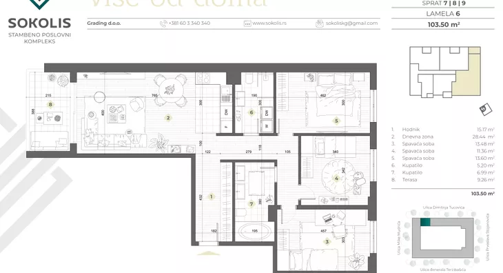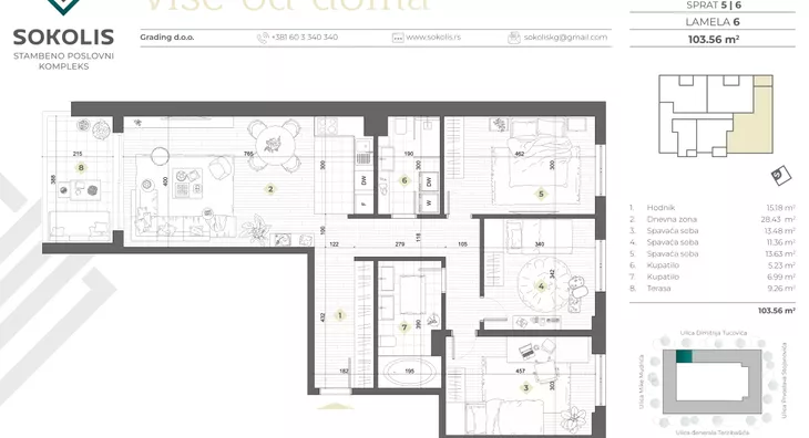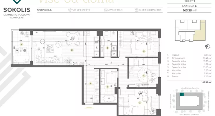 Lokacija: Erdoglija, Kragujevac. Sokolis, stambeno-poslovni kompleks, smešten je na zelenoj lokaciji, udaljenoj samo 15 minuta hoda od centra Kragujevca. Pozicioniran u prestižnom naselju Erdoglija, Sokolis pruža savršen spoj urbanih pogodnosti i prirodnog okruženja. Ovo područje, poznato kao "grad u gradu", obiluje poslovnim centrima, kulturno-istorijskim znamenitostima i gustim zelenilom. Sokolis je smešten preko puta stare Sokolane, koja datira iz 1929. godine i predstavlja simbol ovog dela grada. Sokolana, s originalnom drvenom arhitekturom, danas je kulturno dobro od izuzetnog nacionalnog značaja. Uokvirena vrtom s muzičkim paviljonom i spomenikom Kralja Aleksandra I Karađorđevića, Sokolana pruža stanovnicima Erdoglije osećaj nasleđivanja bogate kulturne tradicije. Sokolis se nalazi na obronku Spomen-parka Šumarice, prostora od preko 350 hektara održavanog zelenila sa deset spomenika i muzejom "21. oktobar". Ova oaza, proglašena kulturnim dobrom od izuzetnog nacionalnog značaja, nudi staze za šetnju i trčanje, pružajući jedinstvenu povezanost sa istorijskim nasleđem. Sokolis nudi okolinu u kojoj su susedi mladi naučnici Univerziteta u Kragujevcu. Građevinsko preduzeće Grading je angažovalo akademske slikare kako bi stvorili vizuelno jedinstven kvart. Lokacija blizu kragujevačkog hipodroma dodatno pridonosi ekskluzivnosti, omogućavajući aktivnosti poput jahanja i vožnje fijakerom. Sokolis je okružen osnovnom školom, vrtićima, restoranima, trgovinama i najvećim tržnim centrom u gradu. Blizina Bulevara Kraljice Marije olakšava pristup prometnim saobraćajnicama, pružajući praktičnost u organizaciji svakodnevnih aktivnosti. Osim toga, uzvišen položaj Erdoglije pruža predivan pogled na panoramu Kragujevca, a zgrada Sokolisa ističe se na horizontu, čineći ovu lokaciju jedinstvenim spojem prošlosti i budućnosti.