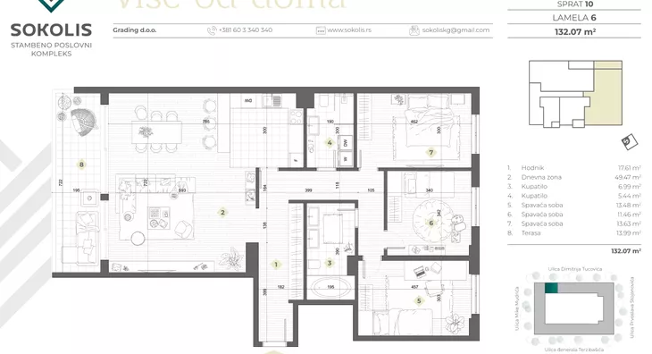 Lokacija: Erdoglija, Kragujevac. Sokolis, stambeno-poslovni kompleks, smešten je na zelenoj lokaciji, udaljenoj samo 15 minuta hoda od centra Kragujevca. Pozicioniran u prestižnom naselju Erdoglija, Sokolis pruža savršen spoj urbanih pogodnosti i prirodnog okruženja. Ovo područje, poznato kao "grad u gradu", obiluje poslovnim centrima, kulturno-istorijskim znamenitostima i gustim zelenilom. Sokolis je smešten preko puta stare Sokolane, koja datira iz 1929. godine i predstavlja simbol ovog dela grada. Sokolana, s originalnom drvenom arhitekturom, danas je kulturno dobro od izuzetnog nacionalnog značaja. Uokvirena vrtom s muzičkim paviljonom i spomenikom Kralja Aleksandra I Karađorđevića, Sokolana pruža stanovnicima Erdoglije osećaj nasleđivanja bogate kulturne tradicije. Sokolis se nalazi na obronku Spomen-parka Šumarice, prostora od preko 350 hektara održavanog zelenila sa deset spomenika i muzejom "21. oktobar". Ova oaza, proglašena kulturnim dobrom od izuzetnog nacionalnog značaja, nudi staze za šetnju i trčanje, pružajući jedinstvenu povezanost sa istorijskim nasleđem. Sokolis nudi okolinu u kojoj su susedi mladi naučnici Univerziteta u Kragujevcu. Građevinsko preduzeće Grading je angažovalo akademske slikare kako bi stvorili vizuelno jedinstven kvart. Lokacija blizu kragujevačkog hipodroma dodatno pridonosi ekskluzivnosti, omogućavajući aktivnosti poput jahanja i vožnje fijakerom. Sokolis je okružen osnovnom školom, vrtićima, restoranima, trgovinama i najvećim tržnim centrom u gradu. Blizina Bulevara Kraljice Marije olakšava pristup prometnim saobraćajnicama, pružajući praktičnost u organizaciji svakodnevnih aktivnosti. Osim toga, uzvišen položaj Erdoglije pruža predivan pogled na panoramu Kragujevca, a zgrada Sokolisa ističe se na horizontu, čineći ovu lokaciju jedinstvenim spojem prošlosti i budućnosti.